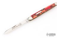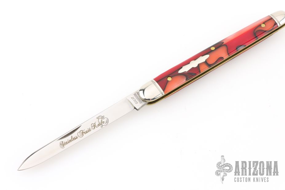 The Fruit Knife or Melon Knife is a classic slip joint pattern with a long, slender spear point blade used for cutting samples from fruit (and sometimes meat) for quality inspection. Due to the nature of use materials that were resistant to corrosion and antimicrobial or easy to clean were chosen. The #89 from Great Eastern Cutlery exhibits their high quality fit and finish and comes with stylish grooved bolsters and a polished stainless steel blade. This version comes with Apples & Oranges Acrylic covers & a 420HC stainless steel blade.