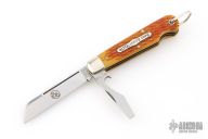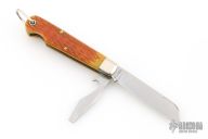 This Beer Scout from Great Eastern Cutlery features a satin finished 1095 carbon steel blade and secondary bottle opener. The handle has nickel silver bolster, Golden Ale Jigged Bone covers, brass liners and steel springs. Comes with original tube and paper. Excellent condition.