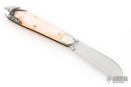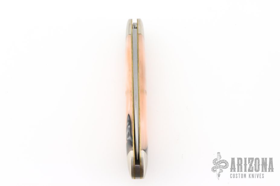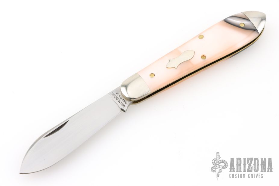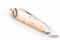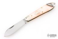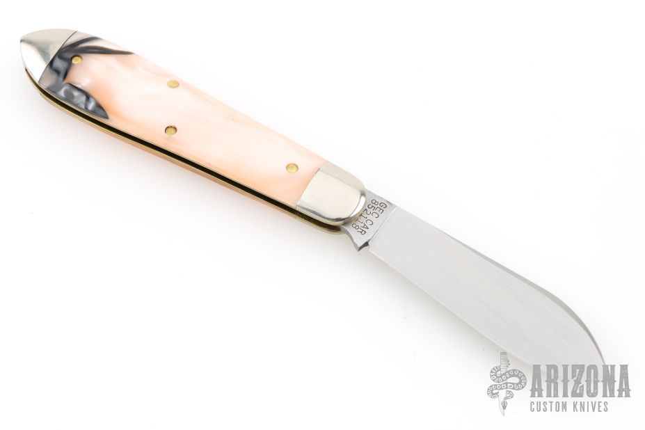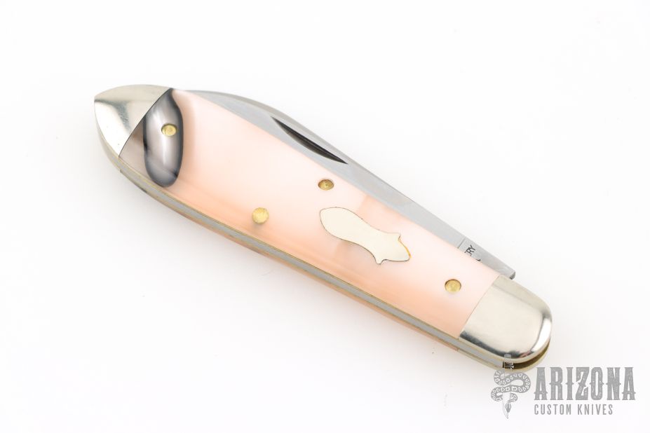 This slipjoint by Great Eastern Cutlery features a satin finished blade with nail nick. The handle has nickel silver bolsters and brass liners, pink synthetic covers. Comes with original tube and wax paper. Excellent condition.