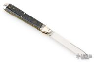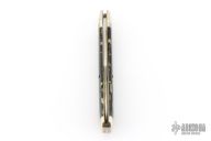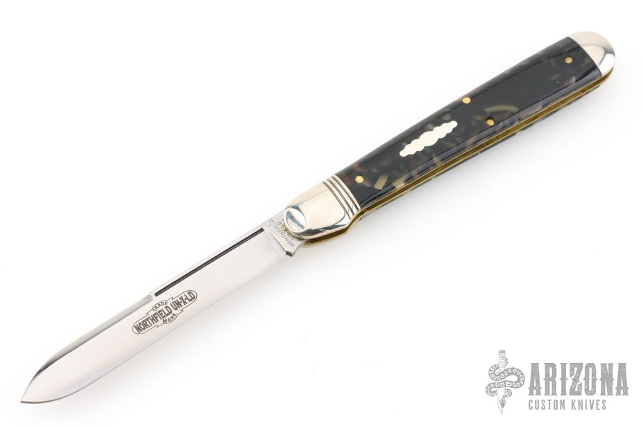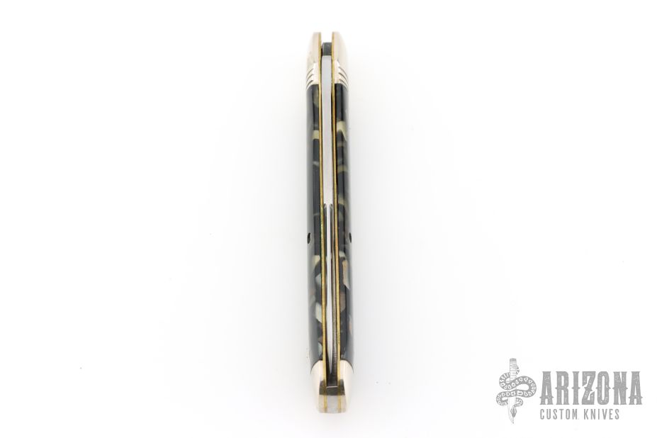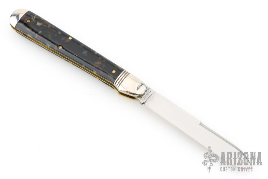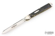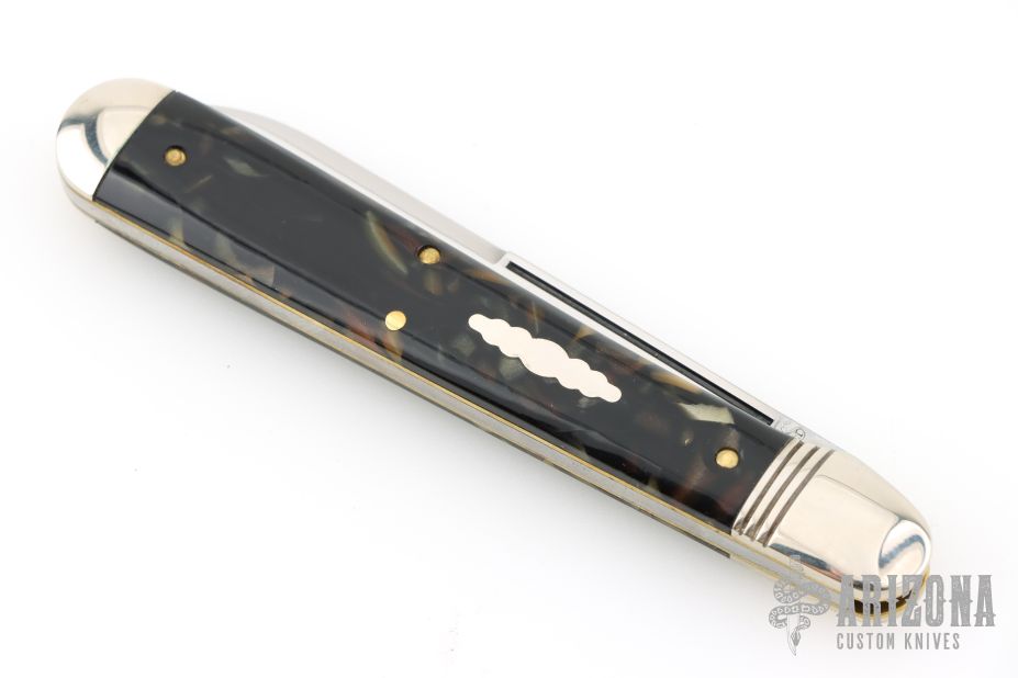 This knife by Great Eastern Cutlery features a polish finished blade with a nail nick. The handle has pinched nickel silver front/rear bolsters and escutcheon, brass liners, black gold perylic covers, steel spring. Has half-stop. Comes with original tube and COA. Excellent condition. Marked with an S on the blade, factory second.