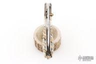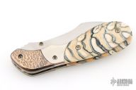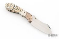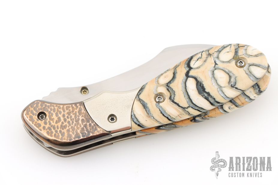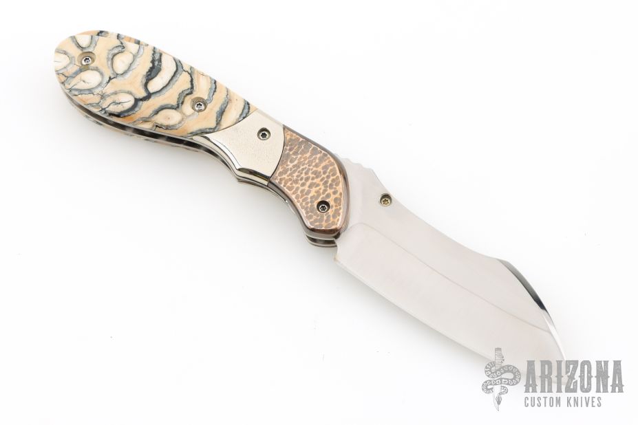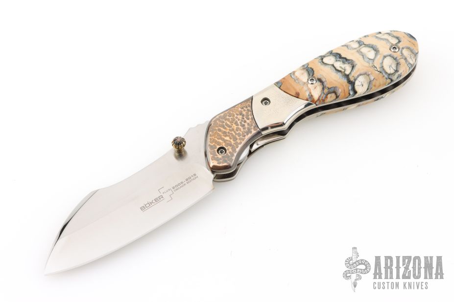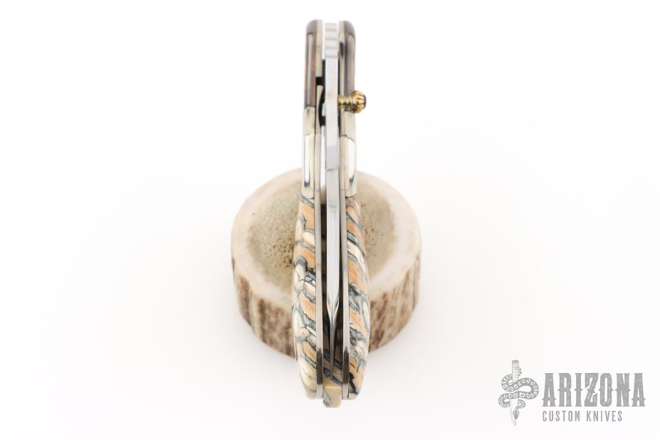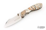 This knife has been customized with a bronze thumbstud with mammoth ivory inlay. The handle has hammered bronze bolsters, orange peel spacers and mammoth tooth scales, titanium liners with jeweled interiors, mammoth ivory backspacer. Nice Stent, lockup and blade seating. Comes with a civivi zippered case. Has a couple light scratches, otherwise excellent condition.