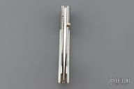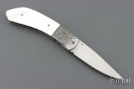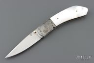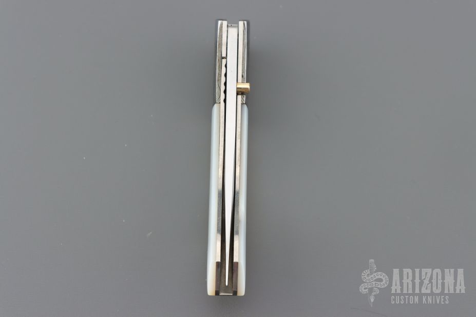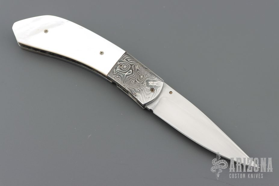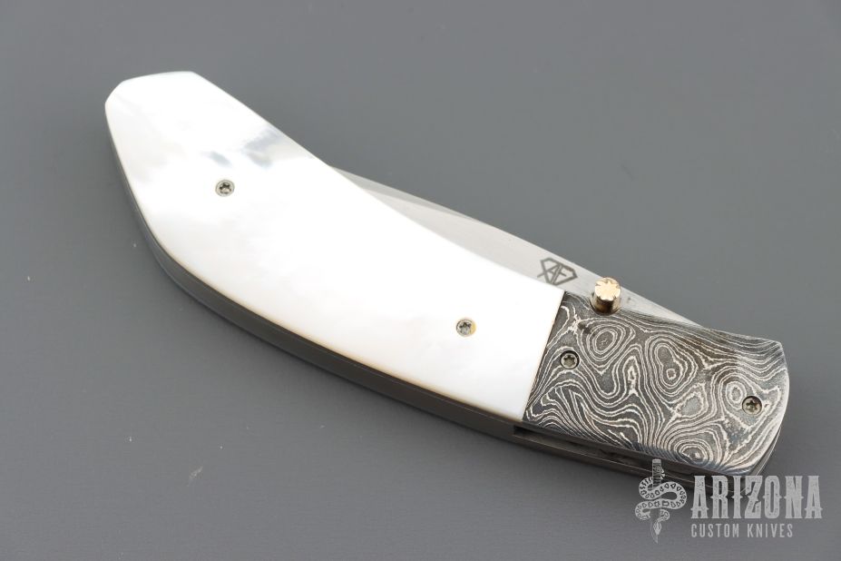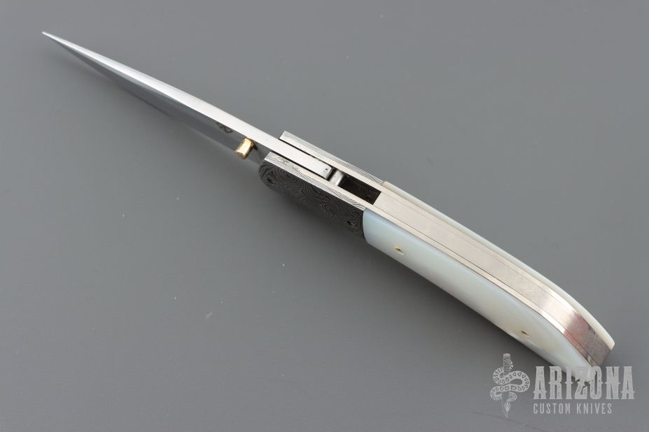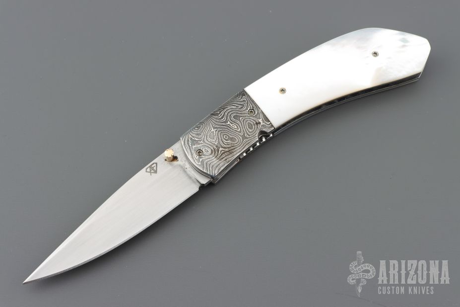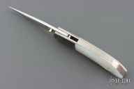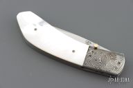 This Gentleman's Linerlock by Aaron Frederick features a hand rub satin finished blade with a single thumbstud. The handle has Damascus bolsters, mother of pearl scales, satin titanium liners and backspacer. Nice detent, lockup and blade seating. Excellent condition. Comes with a zippered case.