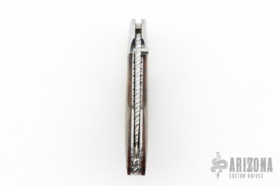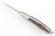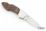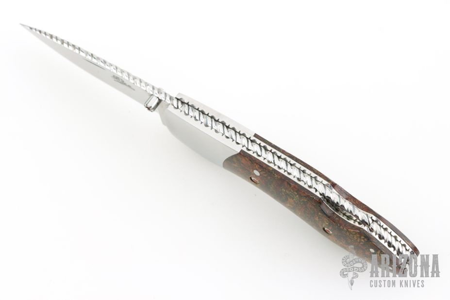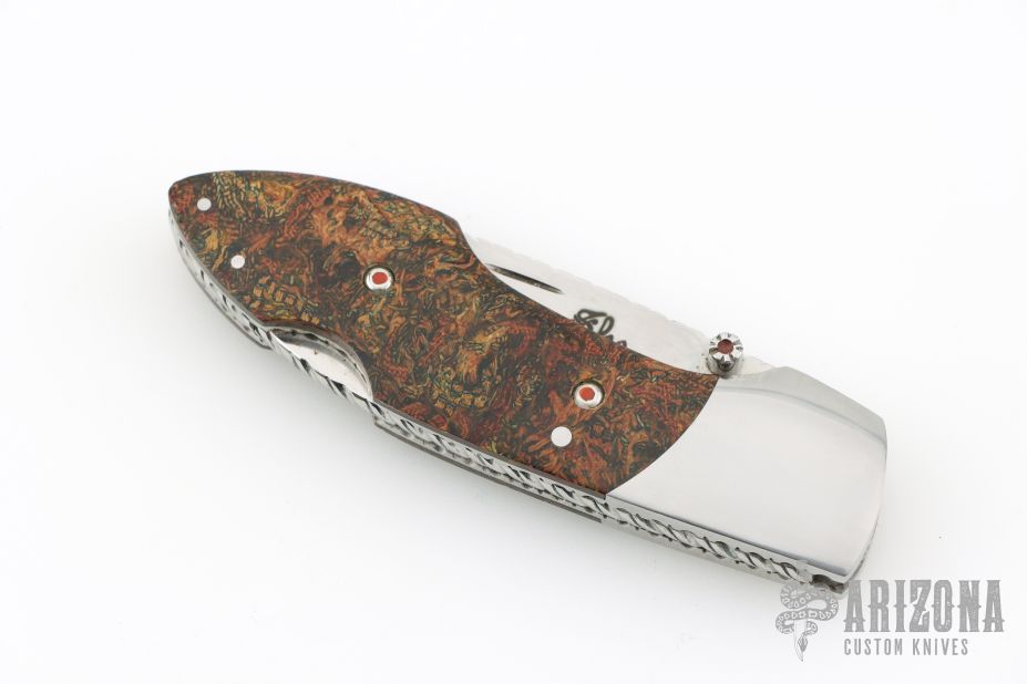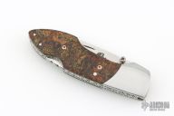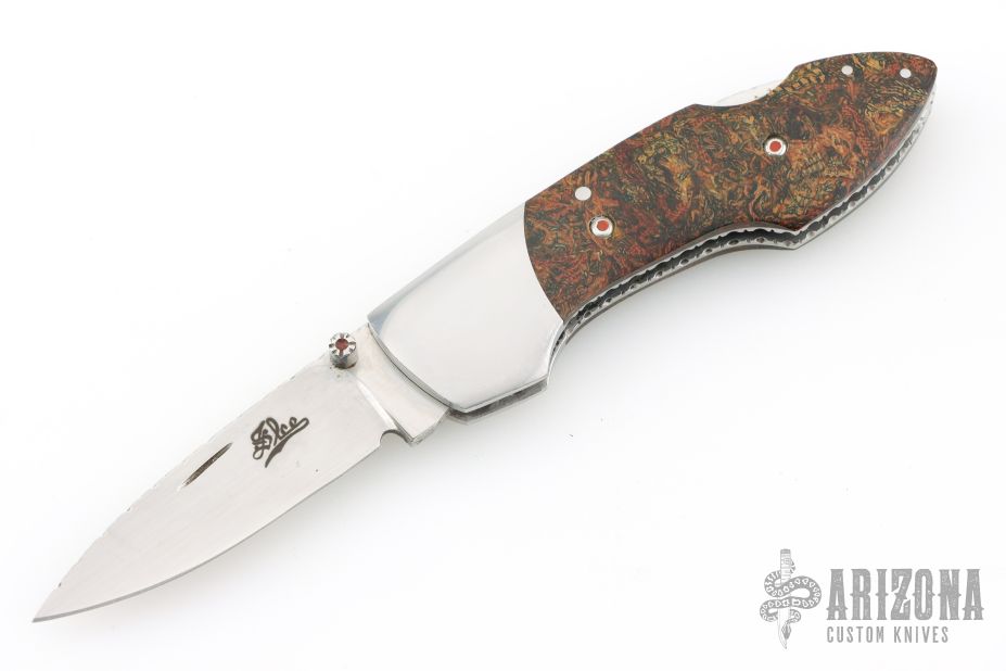 This lockback folder by Fred Slee features a mirror polished blade with fileworked spine, nail nick and thumbstud. The handle has mirror stainless steel bolsters, rag micarta scales, fileworked stainless steel liners and backspacer. Has some light scratches, excellent condition otherwise. Comes with a Velcro case