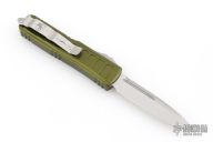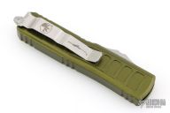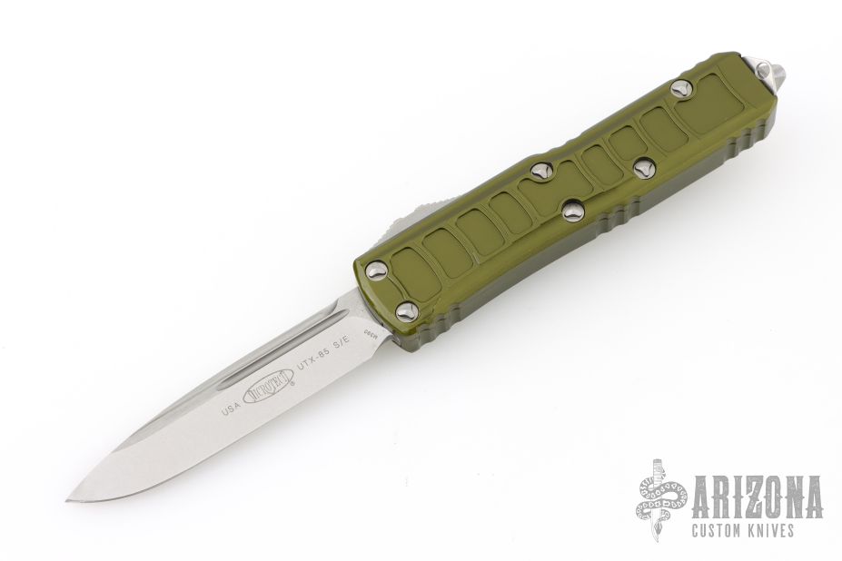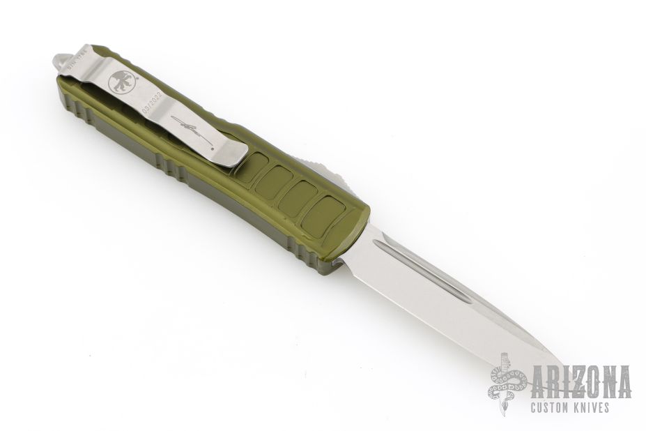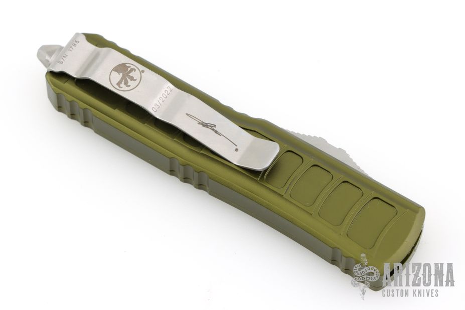 This UTX-85 ii by Microtech features a stonewash finish single edge blade. The handle has a green aluminum frame with blasted hardware and tip down clip. Comes with original box and papers. Dated 03/2022 and S/N 1785.  Includes the original box and papers. Excellent Condition.