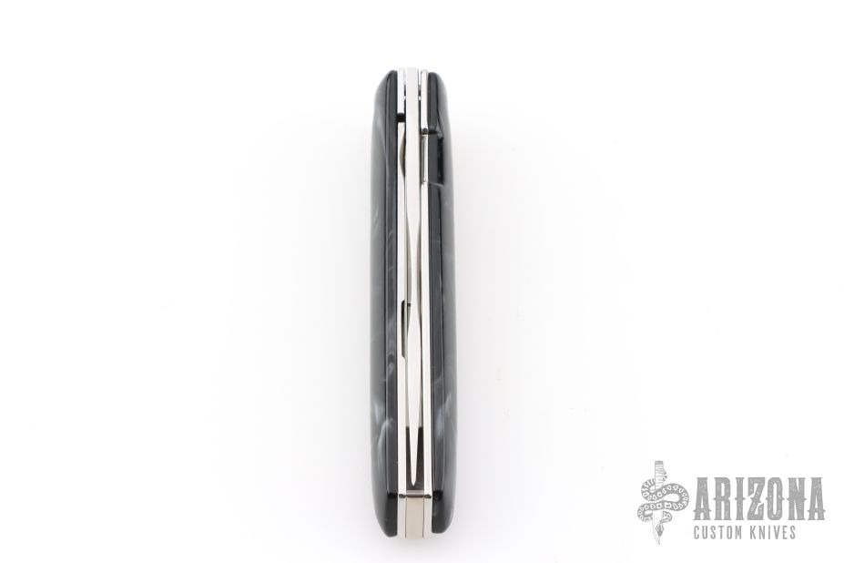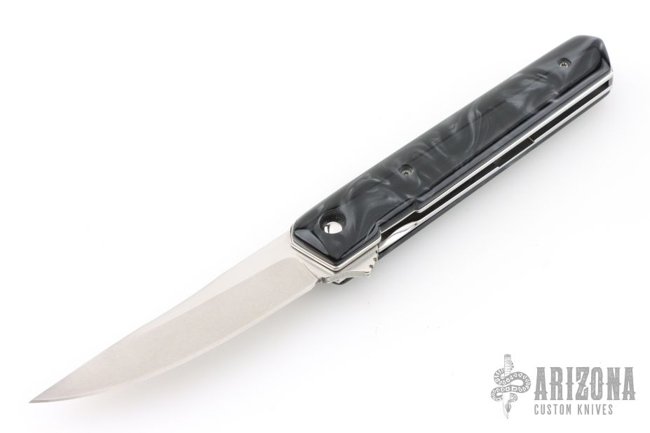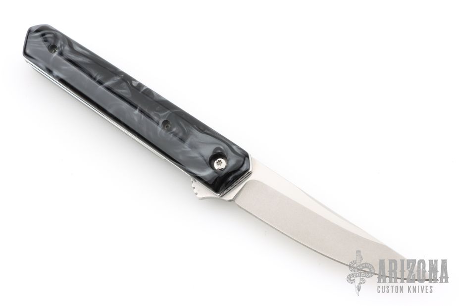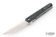 This Burnley Designed Kwaiken flipper has a VG-10 steel clip point satin/polish finished blade with swedge and IKBS bearings. Has polish finished liners, kirinite scales, and polish finished backspacer. Comes in original box. Excellent condition.