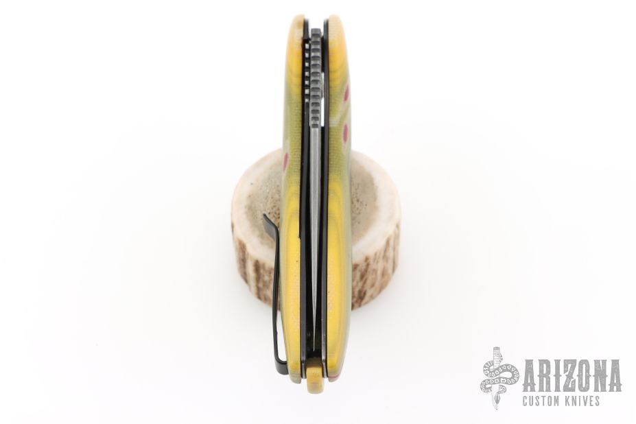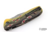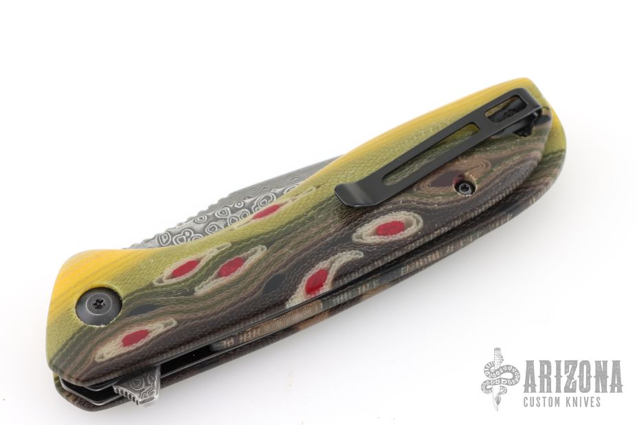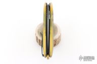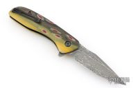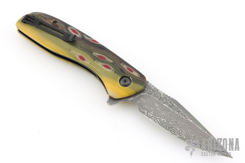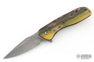 This Linerlock Flipper by Civivi features a Damascus blade with a custom two-tone finish, notched thumbrest and flipper. The handle has custom micarta scales and backspacer, stainless steel liners, and black tip up clip. Rides on bearings, nice detent, lockup and blade seating. Comes with maker's zippered case. Excellent condition.