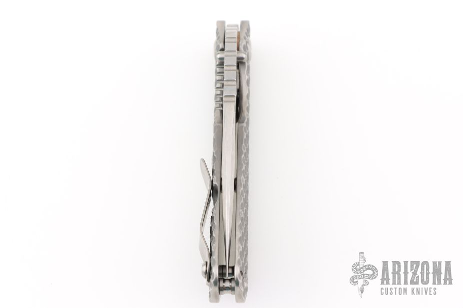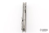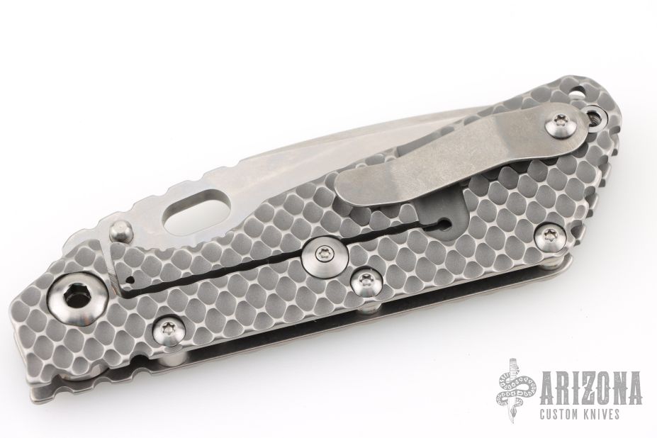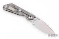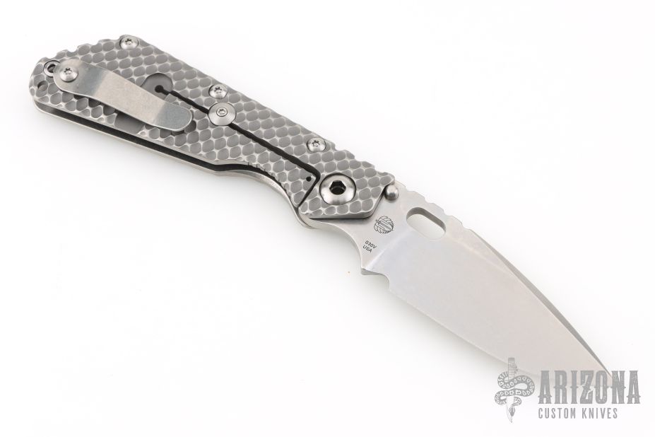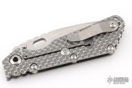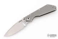 This SMF DGG by Strider has a stonewash blade with dual thumbstuds, thumbhole, and a notched thumbrest. The handle has a titanium "Gunner Grip" frame lockbar stabilizer, and titanium tip up clip. Nice detent, lockup and blade seating. New condition.