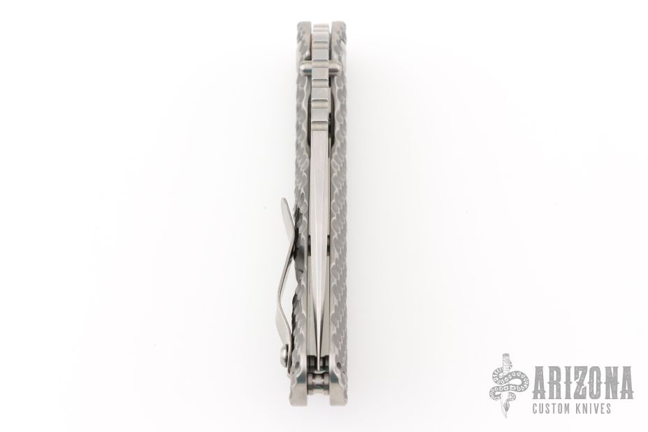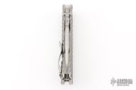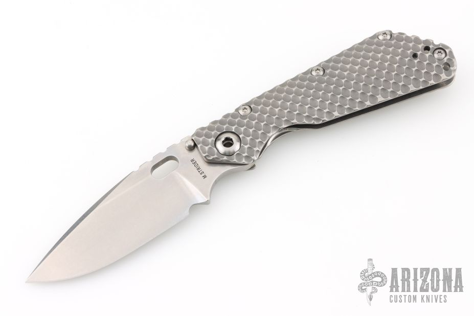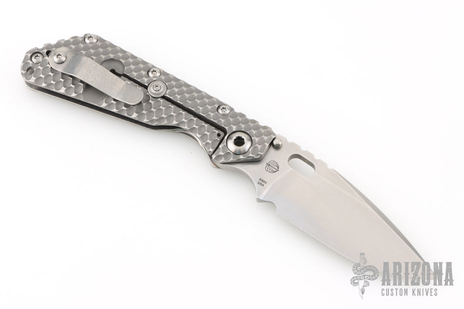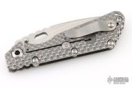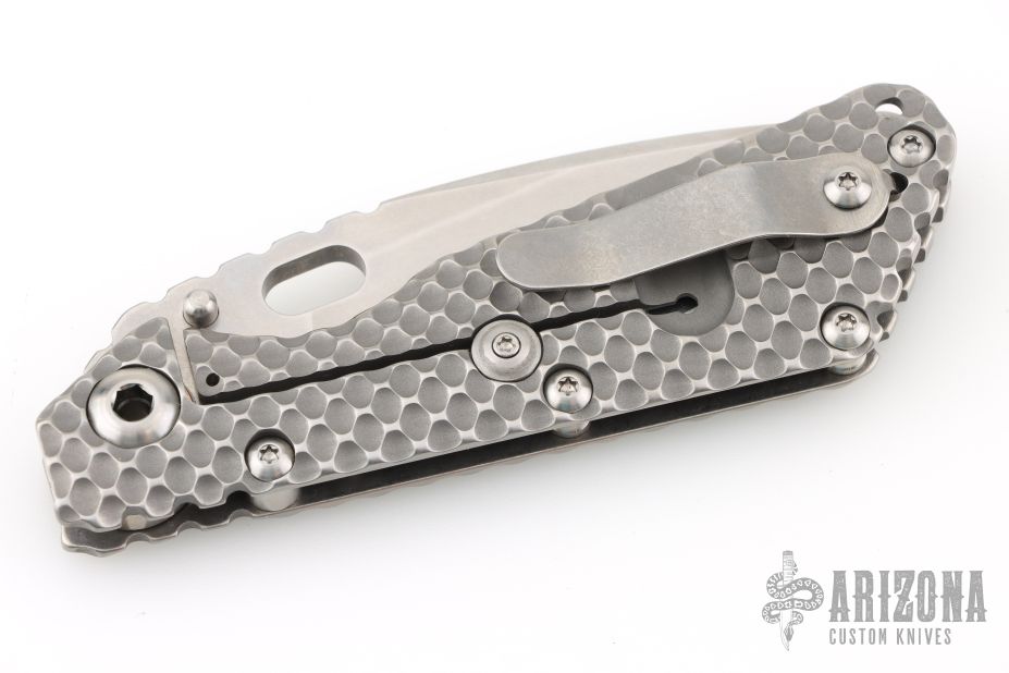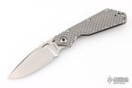 This SMF DGG by Strider has a stonewash blade with dual thumbstuds, thumbhole, and a notched thumbrest. The handle has a titanium "Gunner Grip" frame lockbar stabilizer, and titanium tip up clip. Nice detent, lockup and blade seating. New condition.