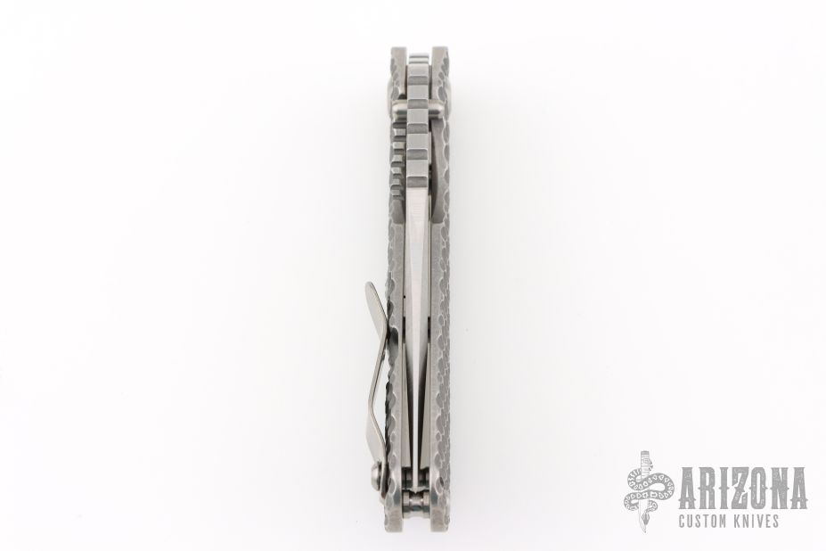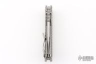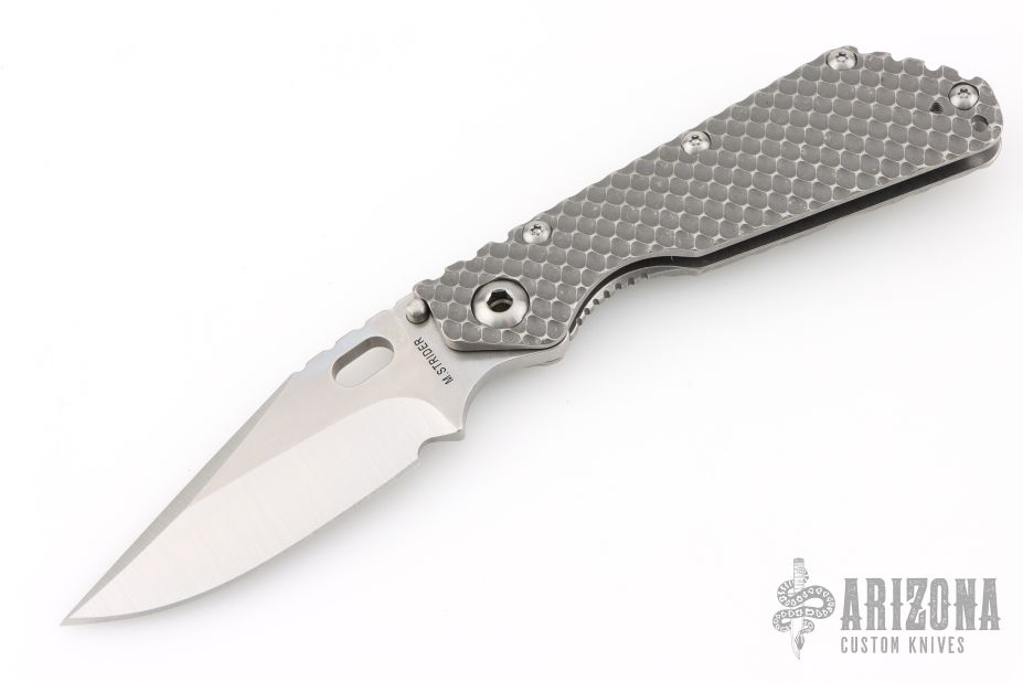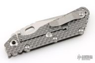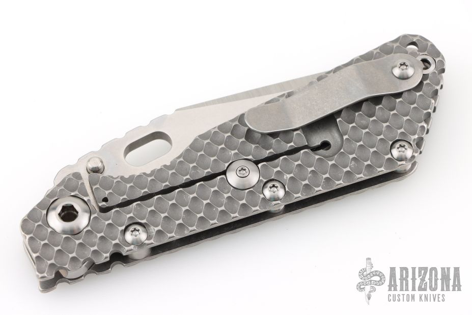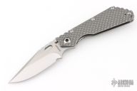 This SMF DGG by Strider has a Bowie blade with dual thumbstuds, thumbhole, and a notched thumbrest. The handle has a titanium "Gunner Grip" frame lockbar stabilizer, and titanium tip up clip. Nice detent, lockup and blade seating. New condition.