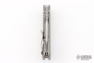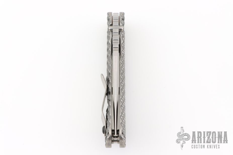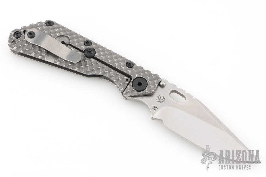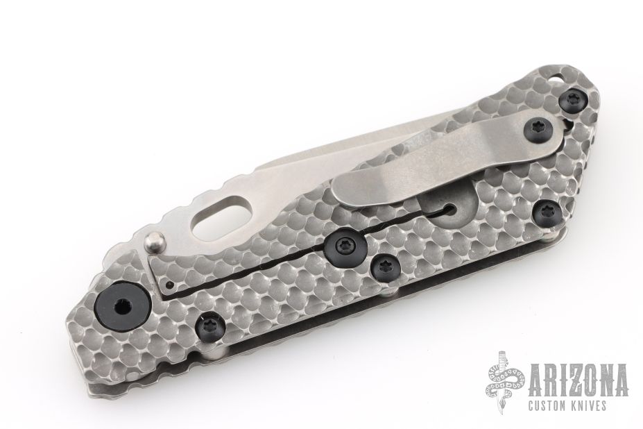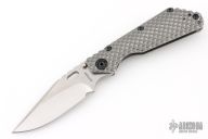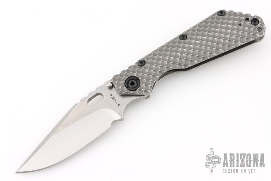 This SMF DGG by Strider has a Bowie blade with dual thumbstuds, thumbhole, and a notched thumbrest. The handle has a titanium "Gunner Grip" frame lockbar stabilizer, and titanium tip up clip. Nice detent, lockup and blade seating. New condition.