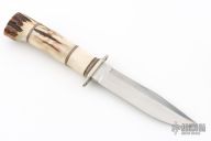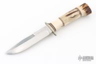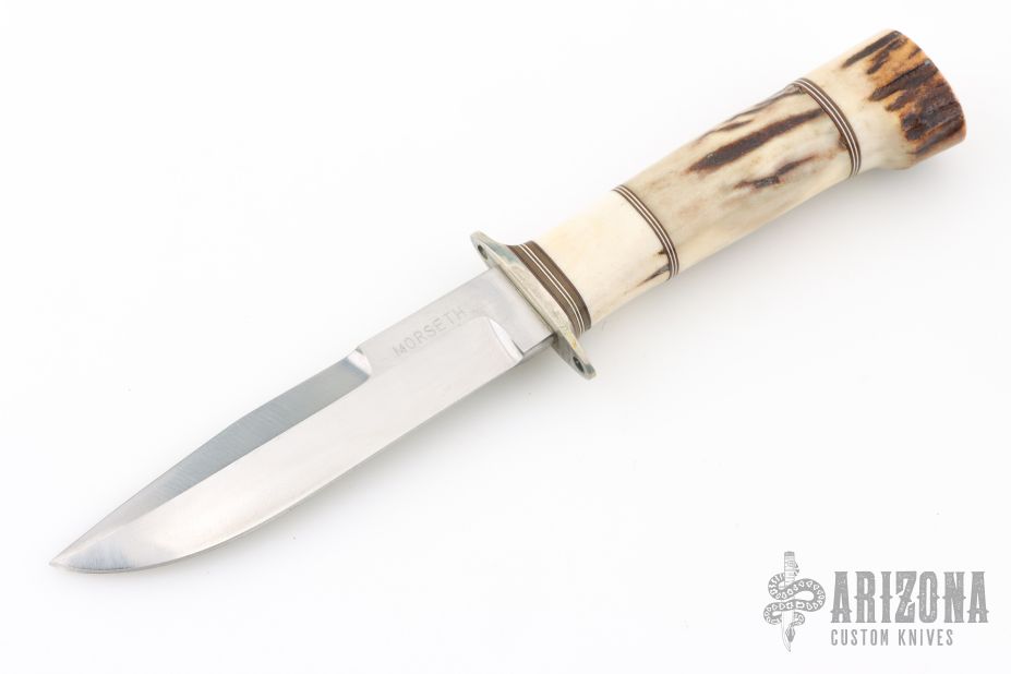 This knife by Morseth Knives features a satin finished laminated blade with .186" blade stock and .931" blade depth, hidden tang construction. The handle has a nickel silver guard, stag grip with red/white spacer pattern. Has some scuffs and patina, excellent condition otherwise.