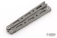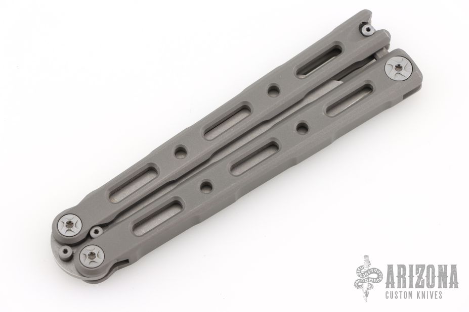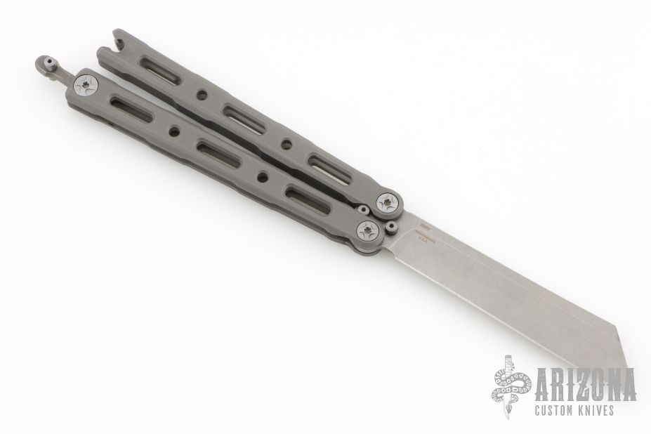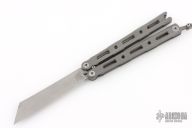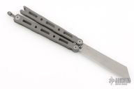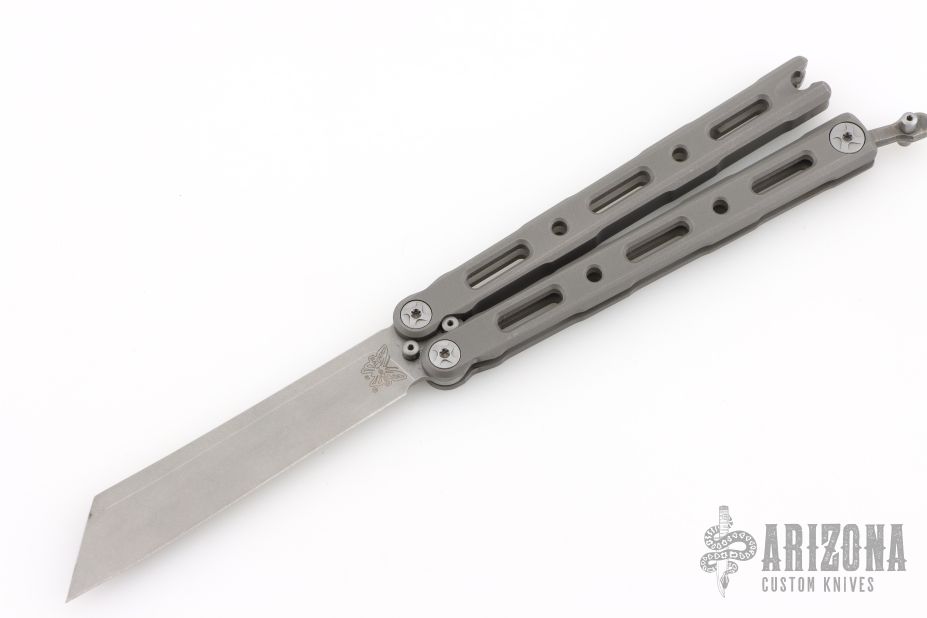 This Model 87 Balisong by Benchmade features a tumble finished wharncliffe style blade. The handle has an integrally constructed, skeletonized titanium frame with bead blast finish. Spring-loaded T latch on pommel. Comes with original box and papers. Has some light scuffs, otherwise excellent condition.