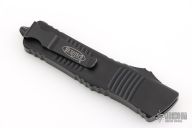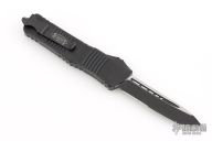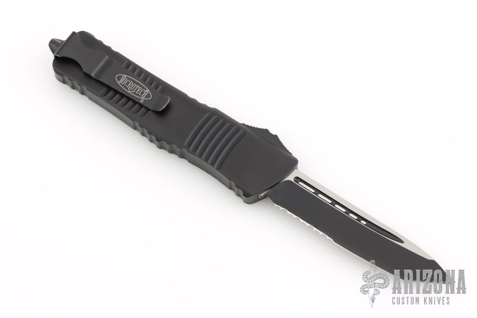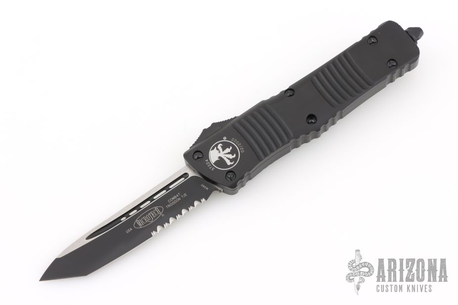 This Combat Troodon by Microtech features a black partially serrated tanto blade. The handle has a black aluminum frame with black hardware and tip down clip. Comes with original box and papers. Dated 02/2022 and s/n 37224. Excellent condition.