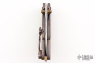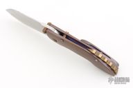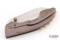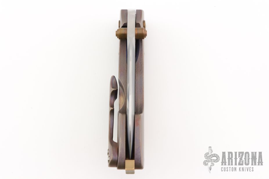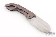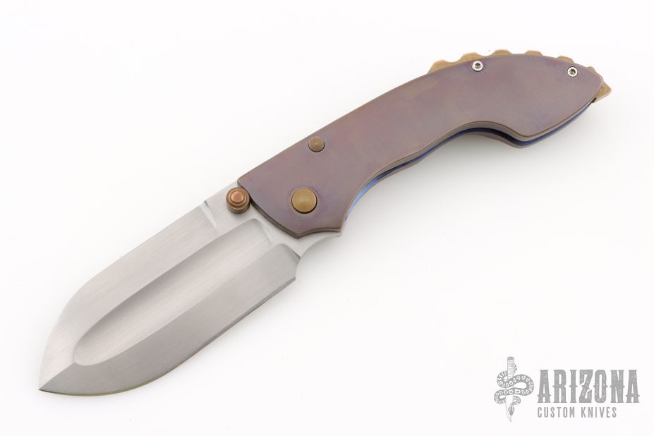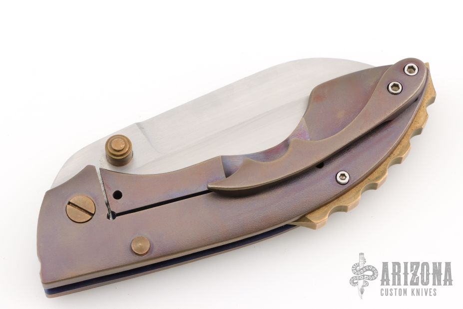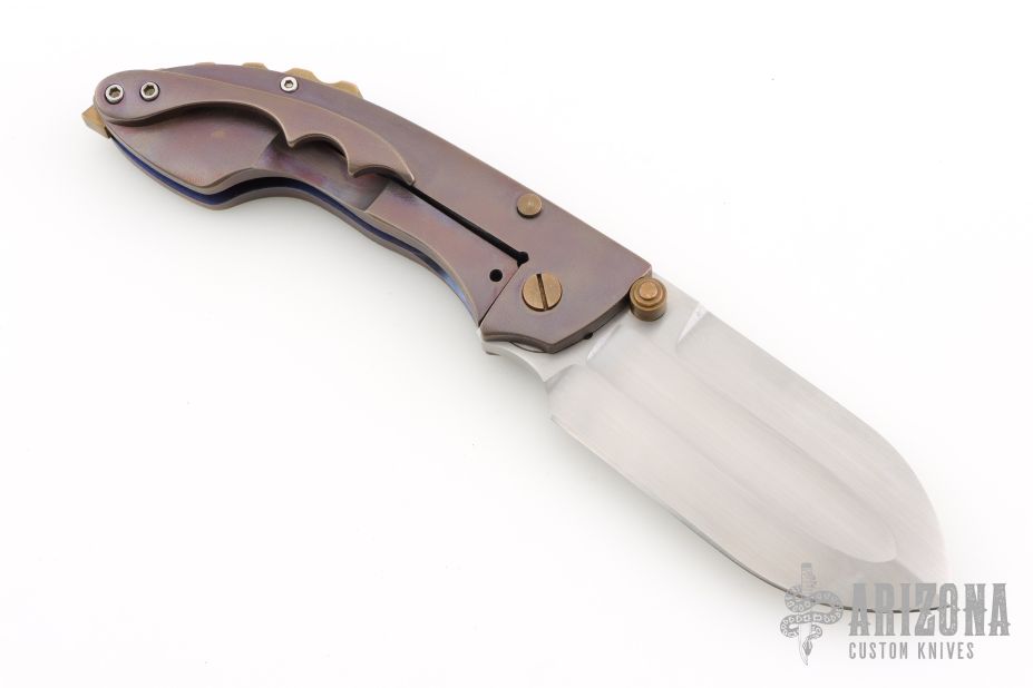 This Gladius by Phil Harvey was modeled after a Roman Short Sword. It features a multiground hand rub satin finished blade with dual thumbstuds, the blade stock is .239" thick. The handle has an orange peel finished and anodized titanium frame and clip, anodized titanium backspacer, colored pivot. Nice detent, lockup and blade seating. This thing is a beast. Excellent condition. Comes with a zippered case.