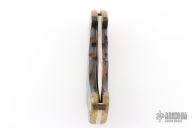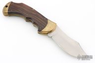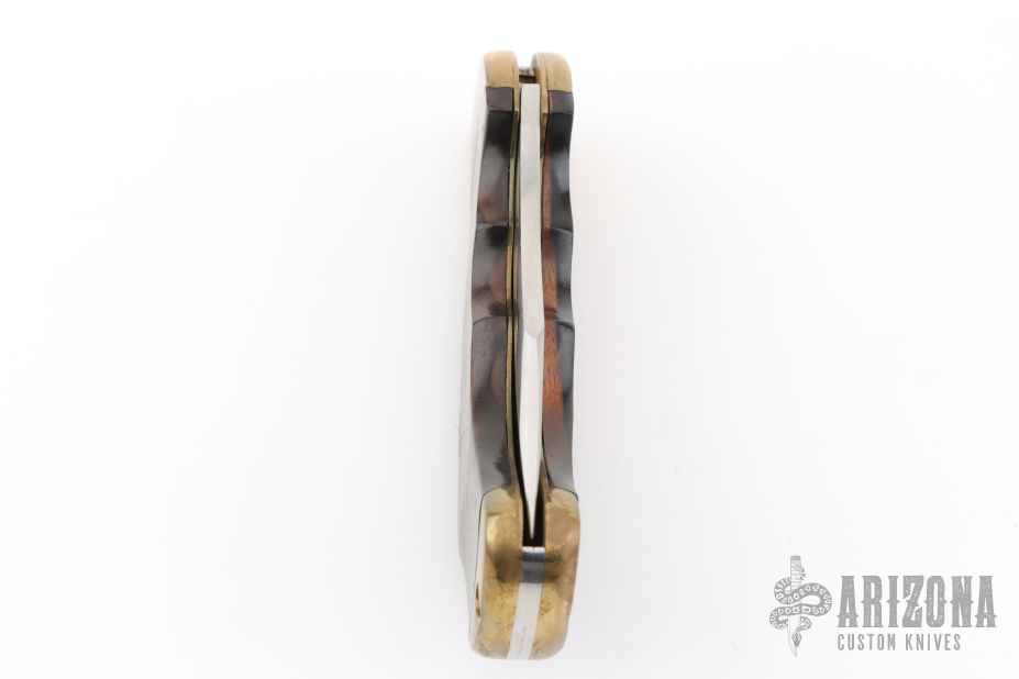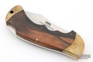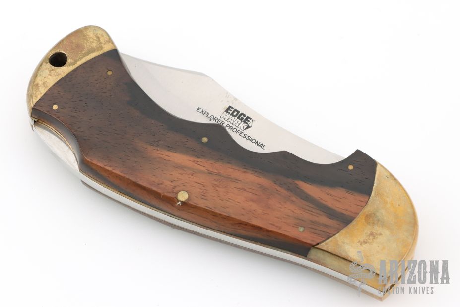 This lockback by Edge Mark has satin finished blade with nail nick. The handle has brass bolsters, rosewood scales, brass liners, stainless steel spring. Has some scratches, otherwise good condition.