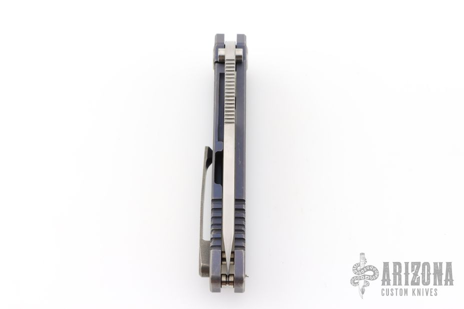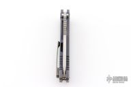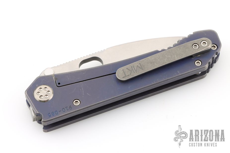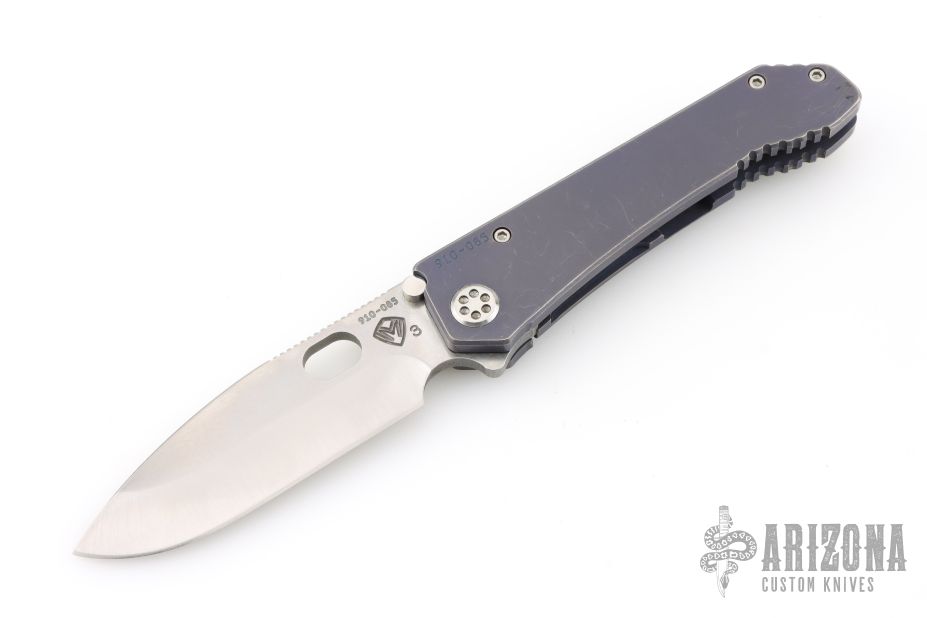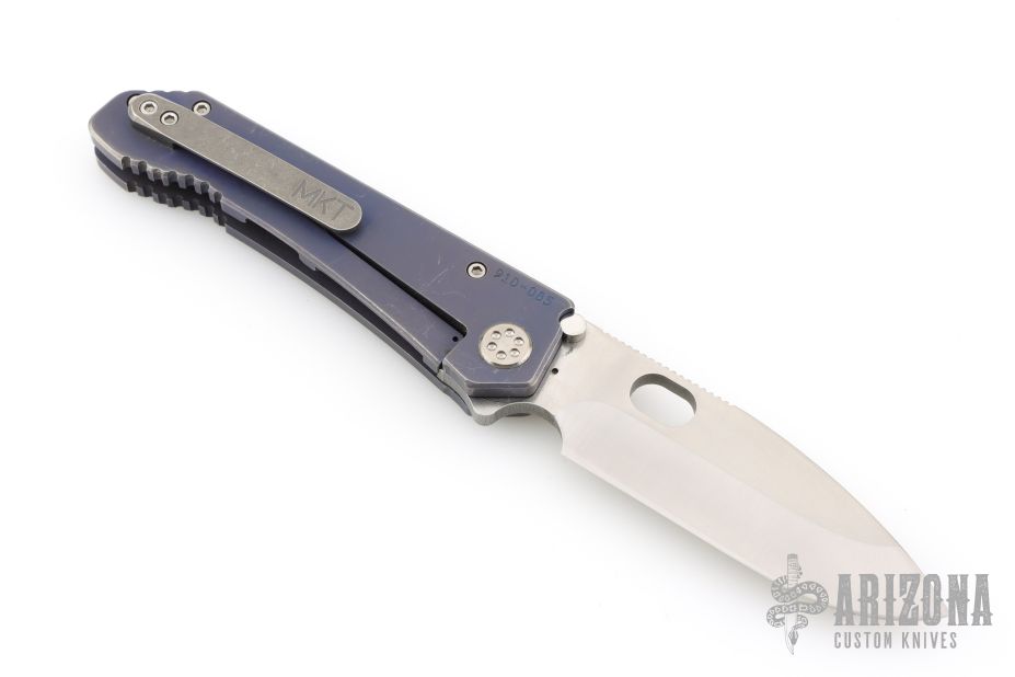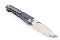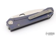 This 187 DPT Drop Point by Medford Knife and Tool features a stonewashed drop point blade with notched thumbrest and thumbhole. The handle has a stonewashed and anodized titanium frame and clip. Nice blade seating, detent and lockup. Comes with original zipper case and dog tag. Has a couple of scuffs and scratches, otherwise great overall condition.