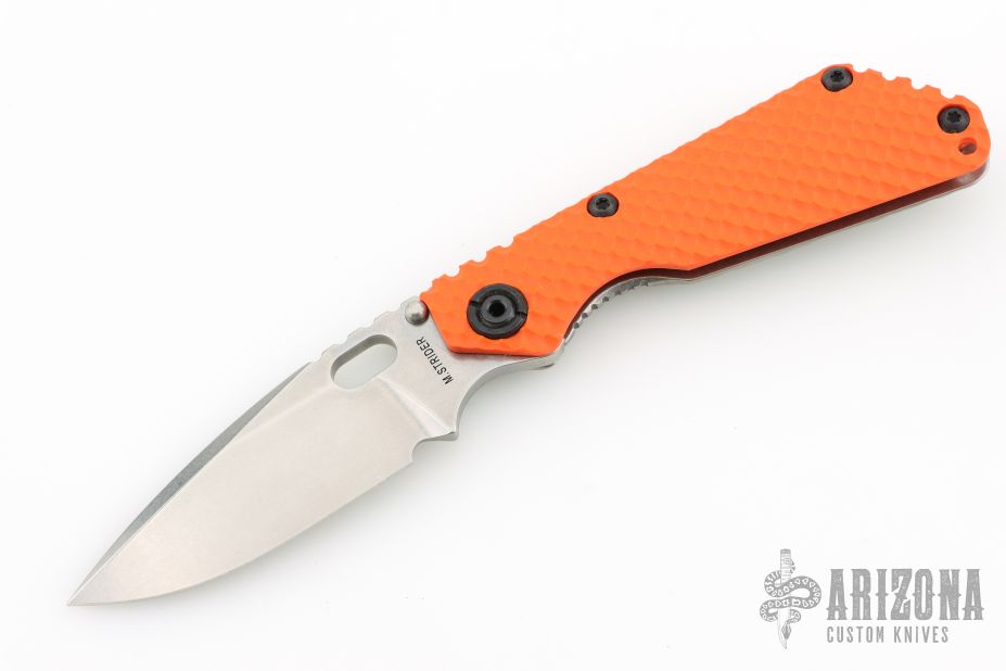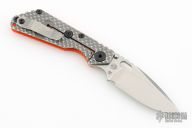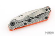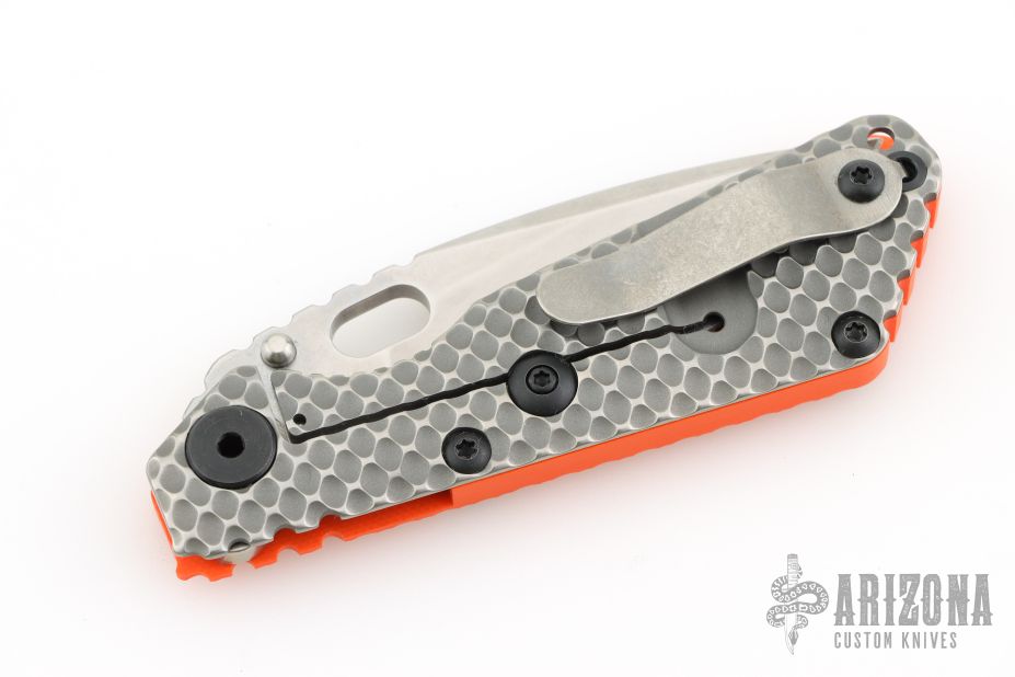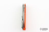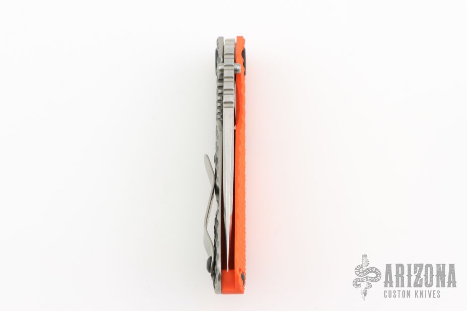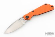 This SNG DGG by Strider has a stonewash finished drop point blade with dual thumb studs, thumb hole, and notched thumb rest. Handle has a orange G-10 and bead blasted titanium "Gunner Grip", lockbar stabilizer, and titanium tip up clip. Nice detent, lockup and blade seating.  New from maker.