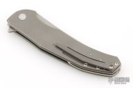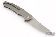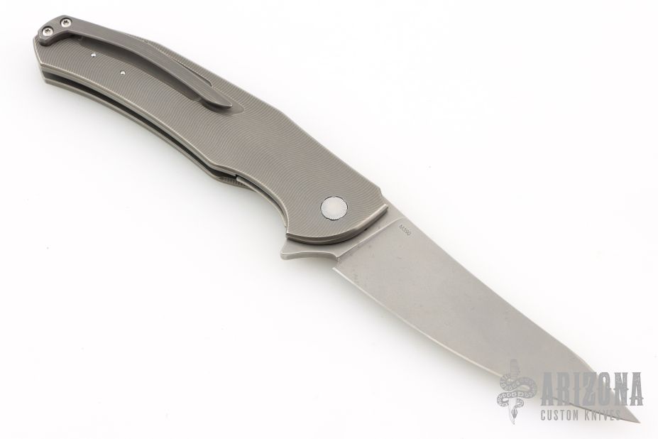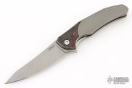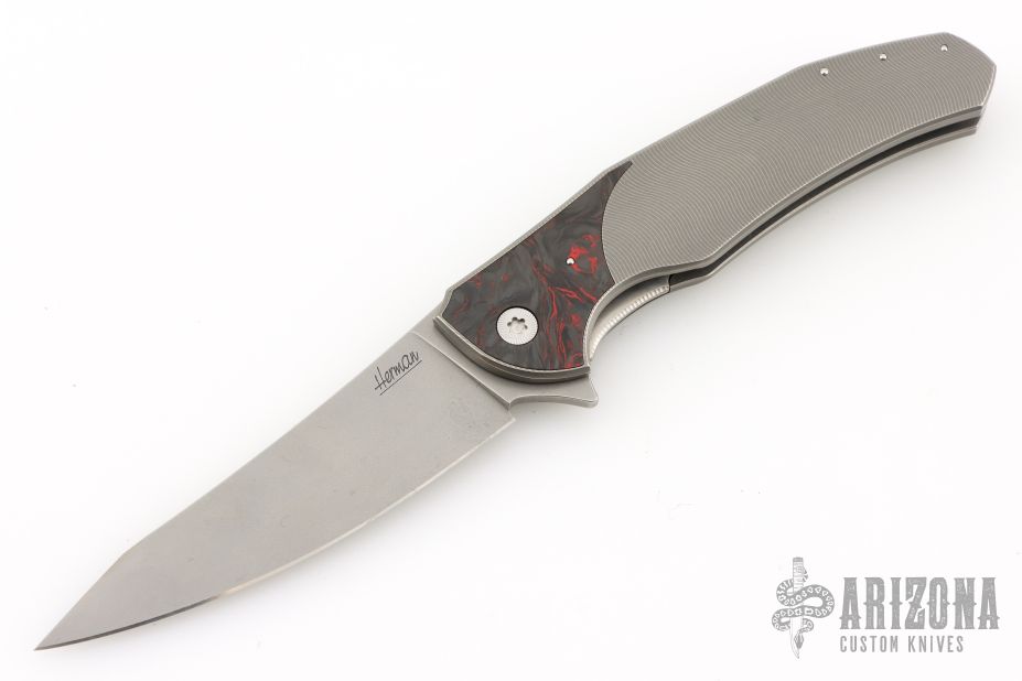 This Ishtar by Herman Knives features a stonewashed blade. The handle is milled and stonewashed titanium frame with an anodized and stippled titanium backspacer and tip up clip. Black/red carbon fiber inlay. Rides on bearings, nice detent, lockup and blade seating.
