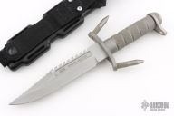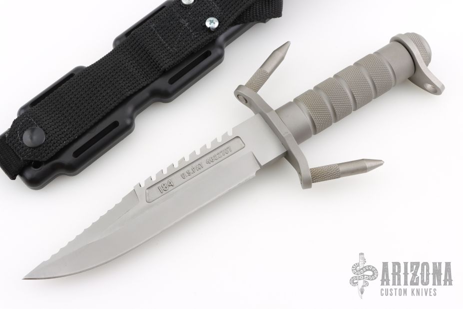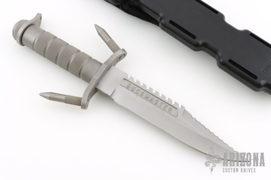 This Buckmaster 184 from Buck Knives has a bead blast blade with a sharpened and serrated top edge, has sawteeth on spine, .291" blade stock and 1.446" blade depth, hidden tang construction and a hollow knurled handle. Includes original sheath. Has some light scuffs and scratches, otherwise excellent condition.