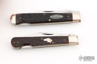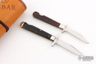 These vintage Swing Guard Lockbacks from Ka-Bar and Union Cutlery Company feature mirror polished clip point blades with nail nicks. The handle is comprised of stainless steel locking swing guard, nickel silver bolsters and pommel with jigged bone scales over brass liners and stainless steel back spring. The large knife is 8.25" overall and the smaller knife is 7.625" overall. Both are in excellent condition. Comes with a leather Ka-Bar knife roll.