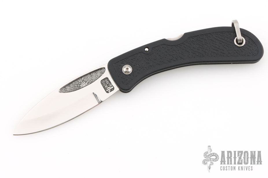 "The Boye Pointed Tip has a curved and pointed utility blade shape. It is as light and flat and useful as we can make it. It's easy to carry and deploy with either hand. This is a basic, all-around knife design that will come through time after time for all sorts of jobs, including the kitchen. But all of this versatility makes this blade a little too dangerous to use in freeing moving lines and people in rough water, in which case the Sheepsfoot blade is recommended. If means permit, consider carrying both - the Sheepsfoot as your primary safety knife, and the Pointed Tip as your workaday companion knife." Boye Blue Whale Lockback Folding Knife with 'Lighthouse with Sailboats' Etching.