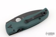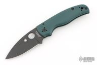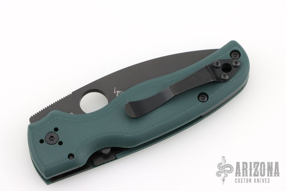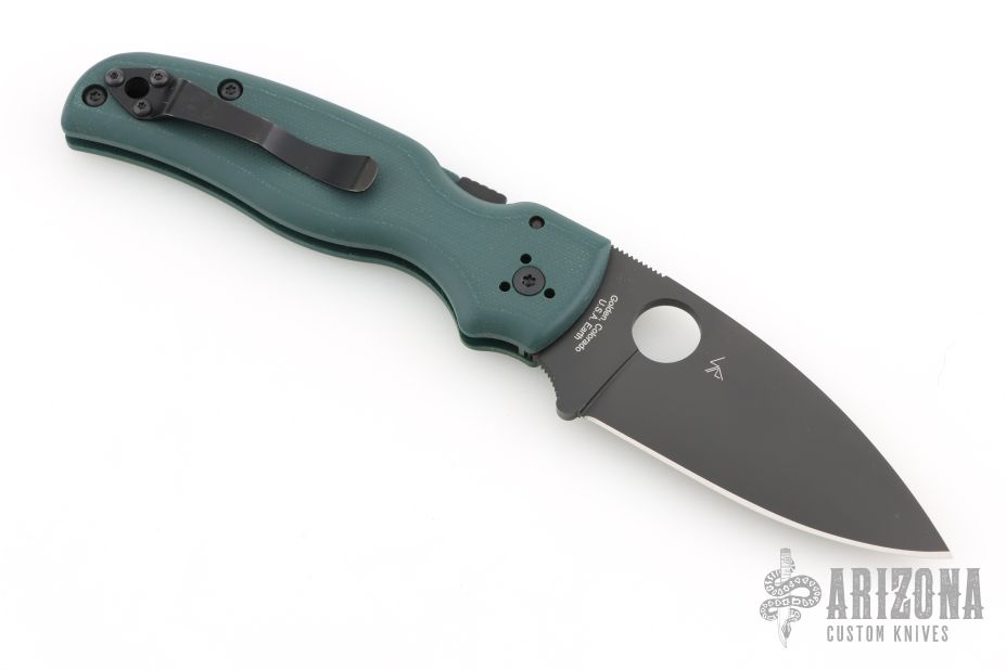This Shaman Pln by Spyderco features a black spear point blade with notched thumb and finger rests, thumbhole. The handle has forest green G-10 scales, inlaid stainless steel liners and a black stainless steel backspacer, 4-way reversible stainless steel clip, lanyard hole at the butt. Excellent condition.