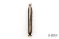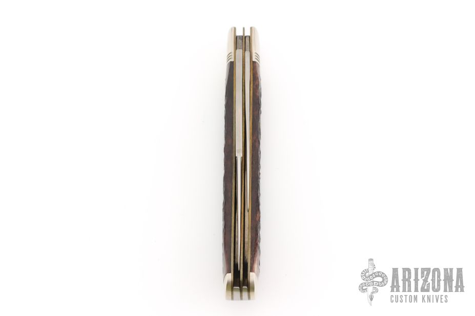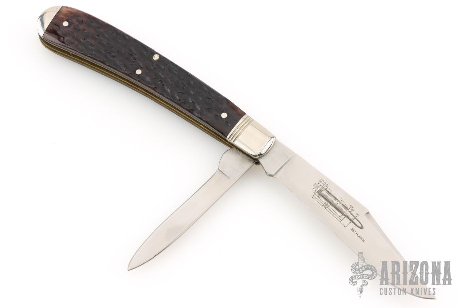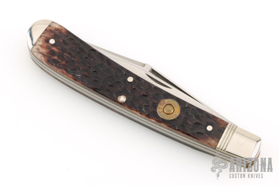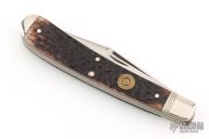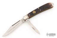 This Slipjoint from Camillus features two satin finished blades with nail nicks. The handle has nickel silver bolsters and jigged bone covers over brass liners and stainless steel springs. Comes with original box and papers. Excellent condition.