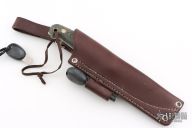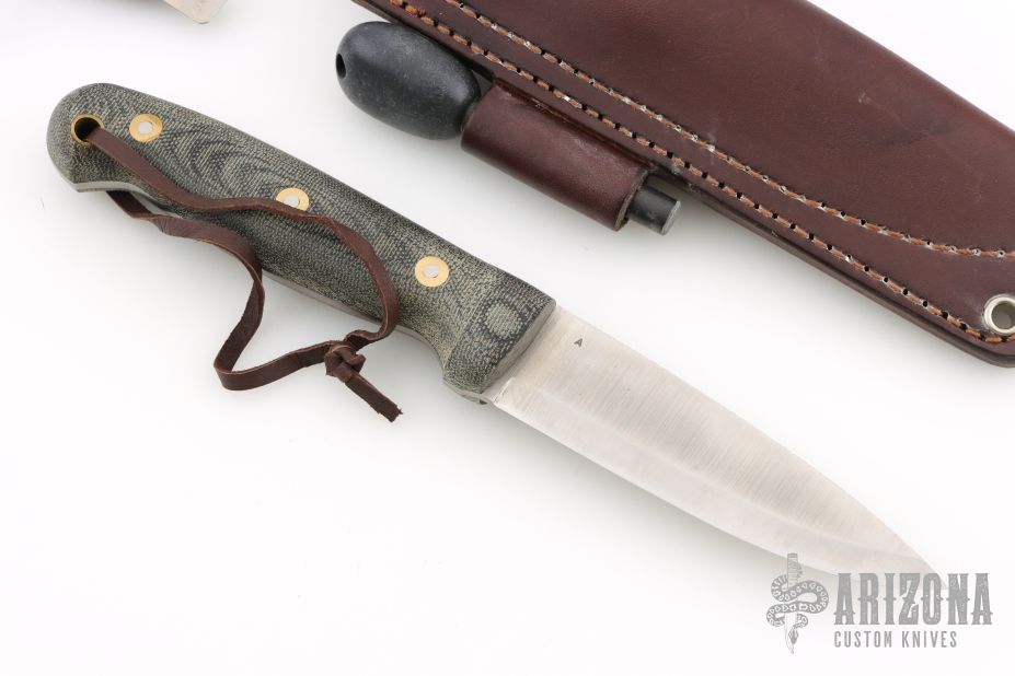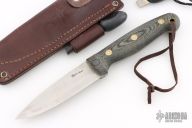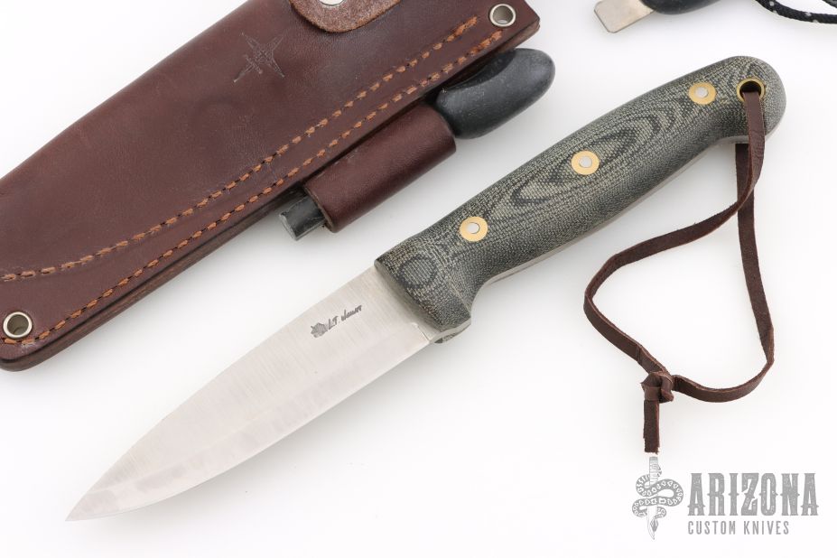 This GNS by LT Wright features a satin finished scandi ground blade with .121" blade stock and 1.168" blade depth, full tang construction. The handle has micarta scales with pins and lanyard hole. Comes with a brown leather sheath, fire steel, and original box. Excellent condition.