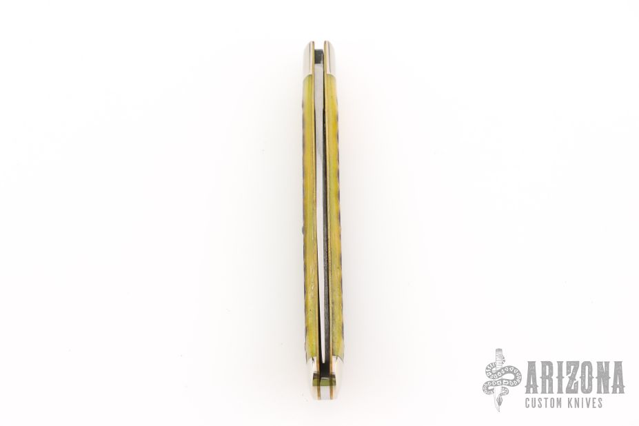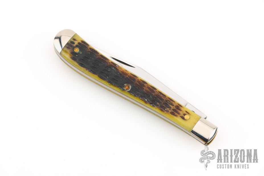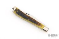 This slipjoint by queen cutlery features a mirror finished blade with nail nick. The handle features nickel silver bolsters, brass liners and jigged bone covers. Steel spring. Comes with original box. Excellent condition.