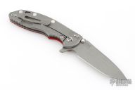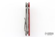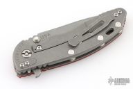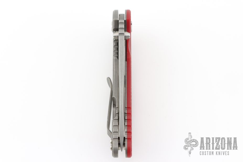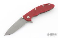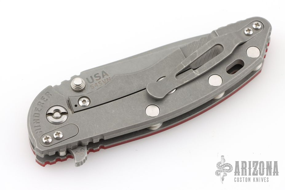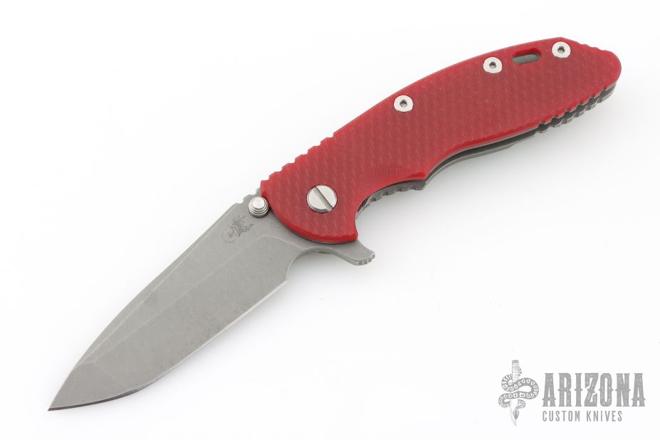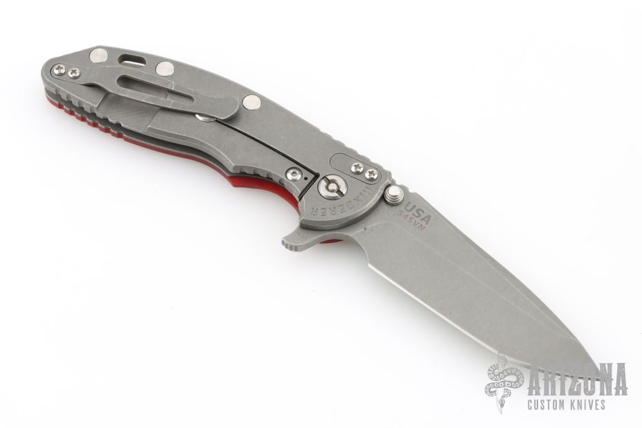 This XM-18 Flipper by Rick Hinderer Knives features a 3.5" working finished blade, notched thumbrest and flipper, dual thumbstuds. The handle has a red G-10 scale, and a working finish titanium handle and satin finished hardware, and matching titanium clip. Clip can be mounted for tip up or down carry. Nice lockup, seating, and detent. Has scuffs and scratches, and a little rusting on the blade. Good condition otherwise.