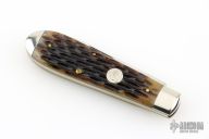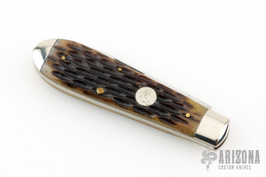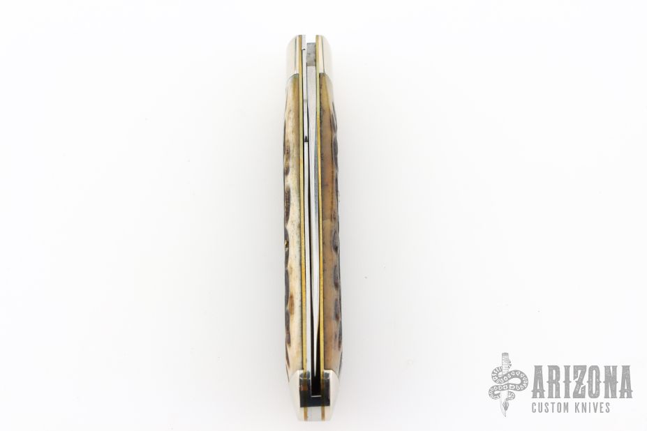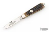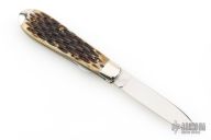 This Teardrop Linerlock by Queen Cutlery features a mirror finished blade with nail nick. The handle has nickel silver bolsters, jigged bone scales, brass liners, stainless steel springs and single steel liner. Comes with original box. Excellent condition.