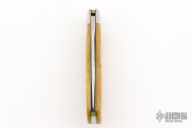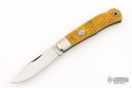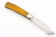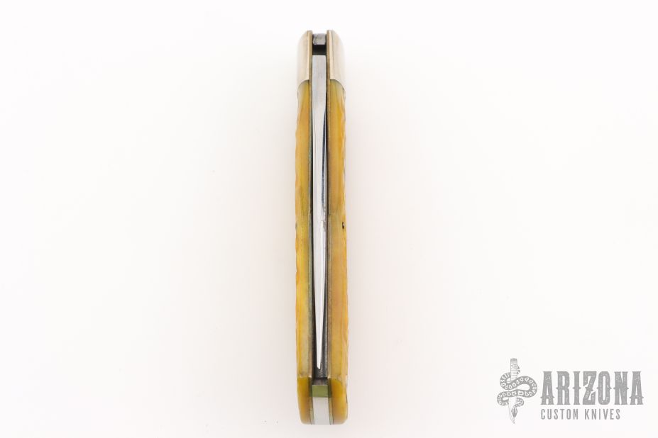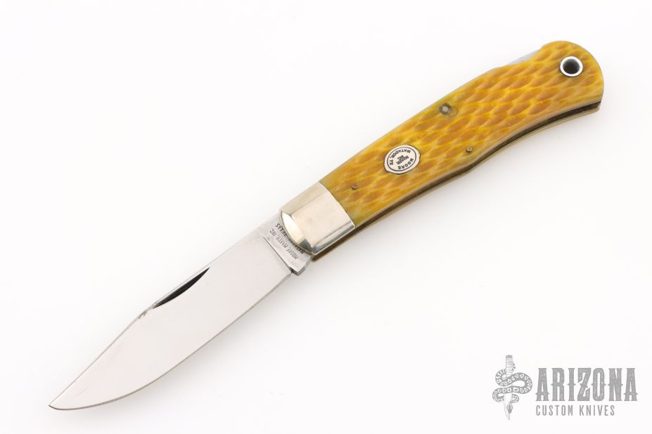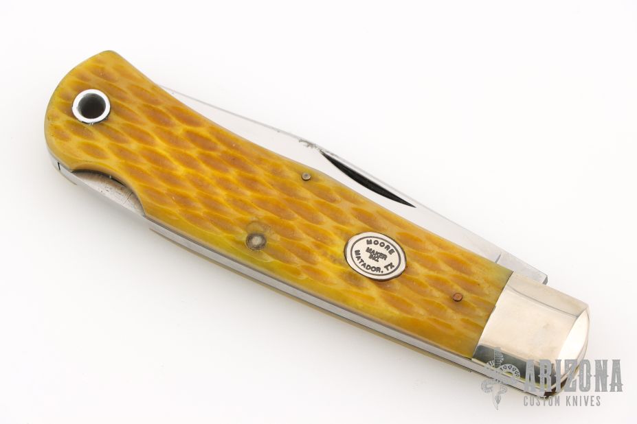 This lockback by Moore Maker features a mirror finished blade with nail nick. The handle has nickel silver bolsters, yellow jigged bone scales, brass liners, stainless steel spring. Excellent condition.