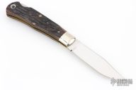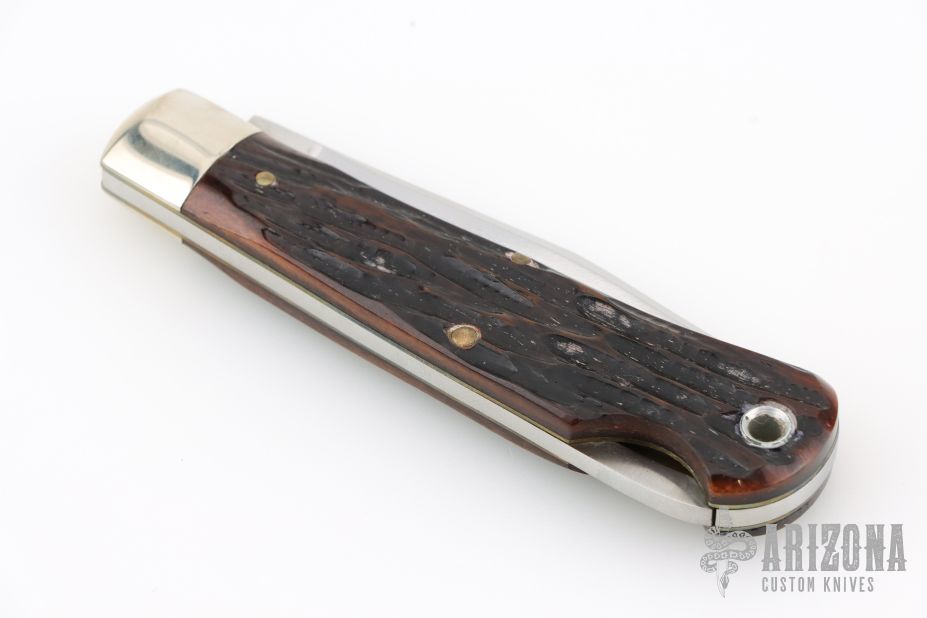This lockback by Queen Cutlery Co features a mirror polished blade with nail nick. The handle features nickel silver bolsters and jigged bone covers over brass liners and stainless steel spring. Includes original box. Excellent Condition.