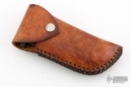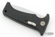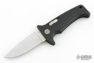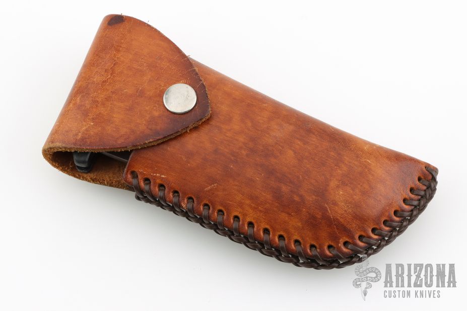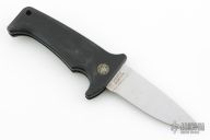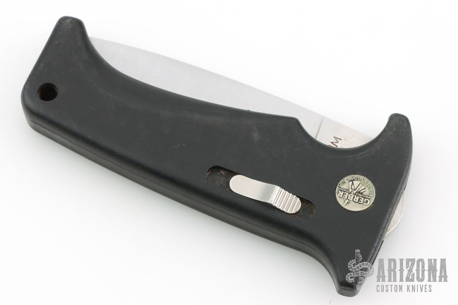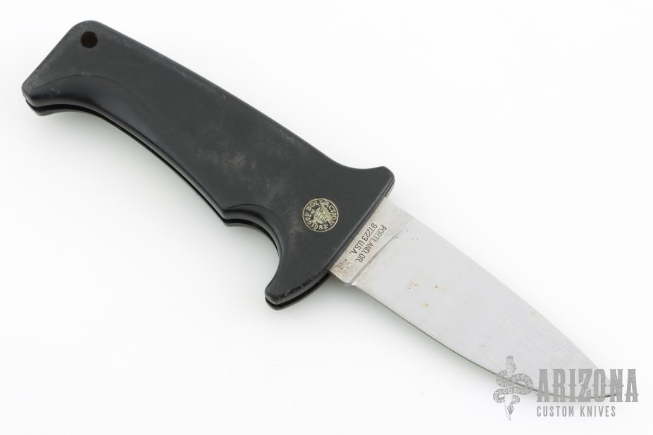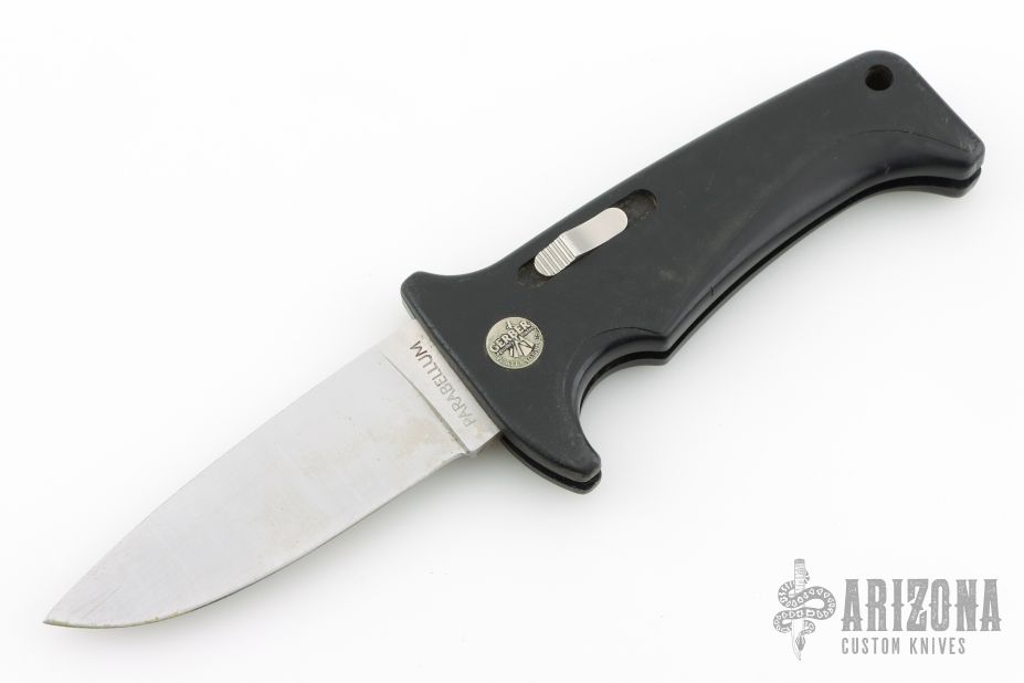 This Rare (pre Fiskars buyout) Gerber Parabellum has a satin finished drop point stainless steel blade. Handle is black polymer with black fiber backspacer and thumb axis-lock button. Lanyard hole. This (circa) early 90s creation comes with a leather belt sheath. There are scuffs, and scratches throughout, good condition otherwise.