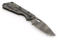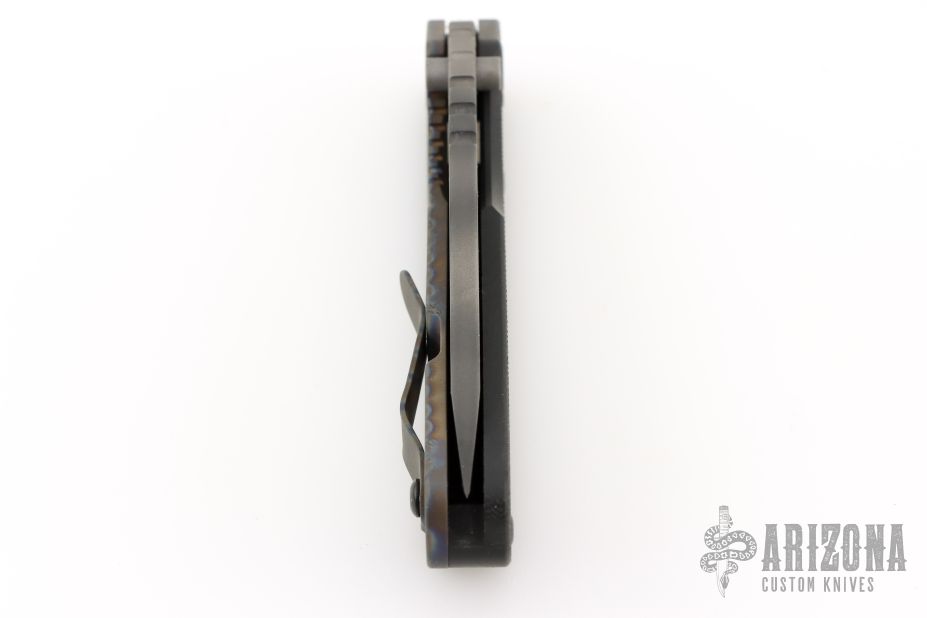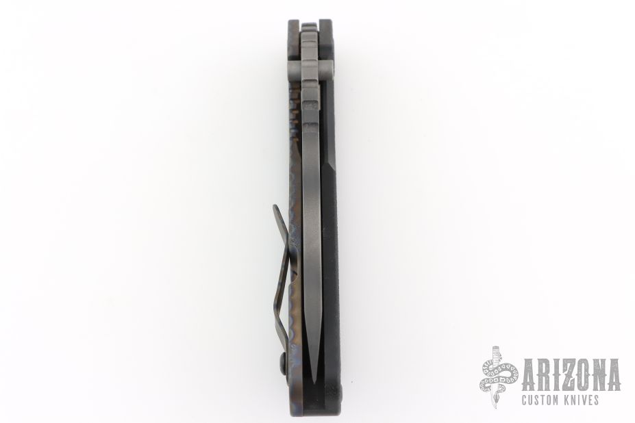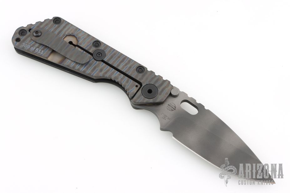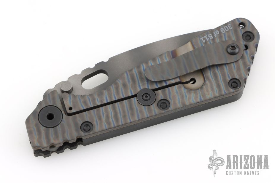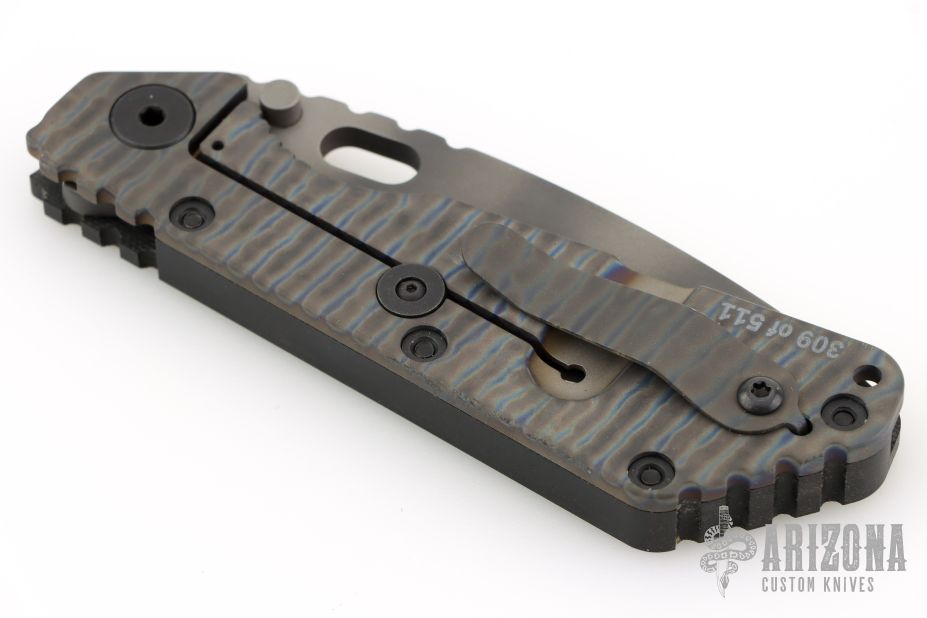 This SMF by Strider Knives features a tiger striped blade and textured black G-10 and flamed titanium handle and matching tip up titanium clip. Notches on thumbrest, rear of handle, and early lockup. Includes Hinderer "Lock Bar Stabilizer" for maximum reverse lock retention. Excellent condition. Comes with original box, papers and velcro case.