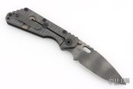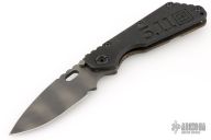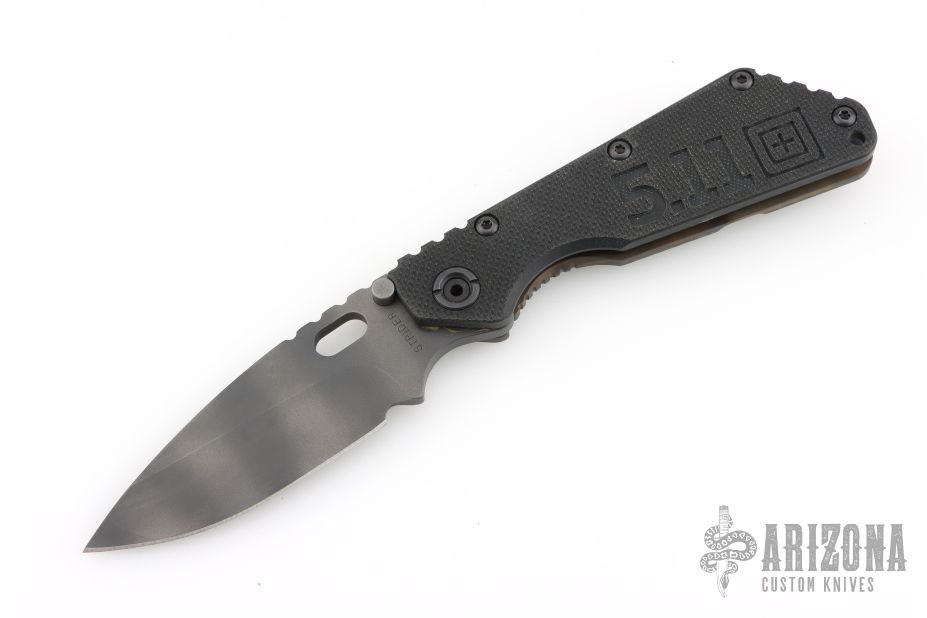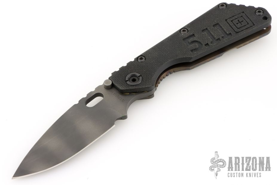 FROM 5.11 Tactical Website: An exclusive offering for 5.11® online shoppers, the Strider SMF Frame Lock knife is the result of a collaborative project between Tom Davin, the CEO of 5.11, and Duane Dwyer, the Co-Owner of Strider Knives™. The goal of the project was to produce a truly exceptional knife embodying the quality, performance, and aesthetics that define the 5.11 brand. After a year in development at the Strider manufacturing facility in Southern California, the project was an overwhelming success. The Strider SMF is 100% American made, and marks the first commercial knife production using Carpenter Technologies CTS® B75P Particle Metallurgy Grade Steel. The 4” blade is hollow ground by hand, and features a classic Spear Point profile, a thumb hole, an oversized pivot pin, twin bump stops, and jimping along the spine for enhanced control. The scale handle is crafted from solid glass epoxy laminate with a rough peel texture for positive grip under any conditions. Peripheral edges are quarter-rounded to match the handle scale, and the internal structure is custom pocket-milled to mate the blade directly to a 3mm thick titanium foundation. An aggressive flame finish and a prominent 5.11 logo machined into the handle provide a bold look that is sure to turn heads. Imagined and engineered for utilitarian performance and eye-catching appeal, the Strider SMF knife is an unparalleled workhorse, an unfailing battlefield companion, and, with only 511 knives made, an heirloom-quality collectible. Overview: Heirloom quality SMF Frame Lock Knife Limited edition, 511 made Classic spear point blade Flame striped finish Titanium lock Jimped for enhanced control Solid glass epoxy laminate handle.