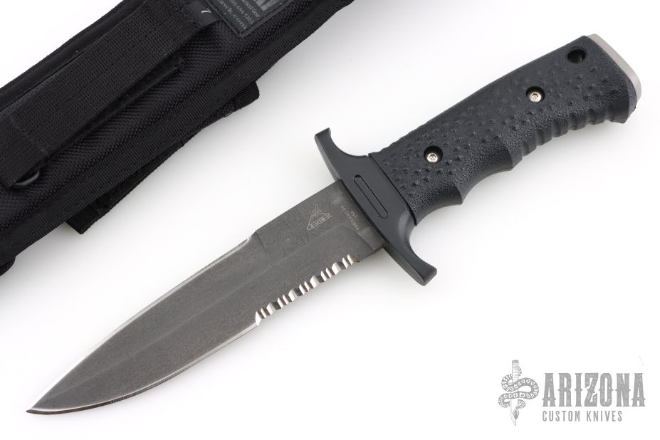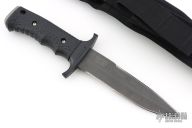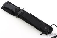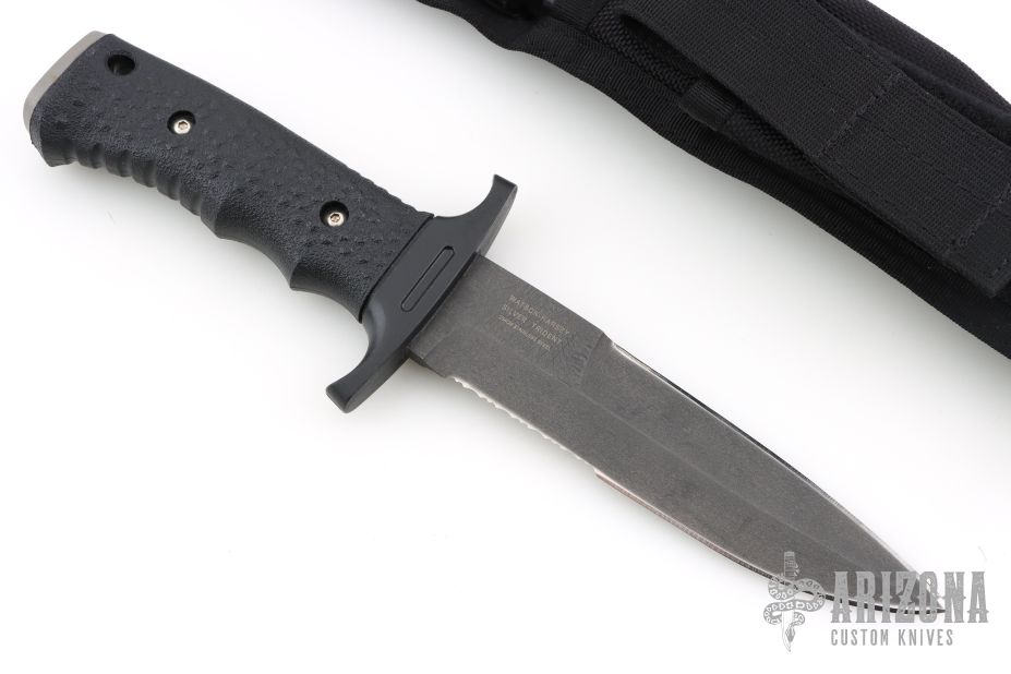 "The Silver Trident is more than a symbol of America's top Special Ops personnel. It's living proof that guys who handle our nation's nastier chores will go through whatever kind of hell is necessary, so long as they have the best gear. The Silver Trident has the most technically advanced handle ever engineered on a combat knife. It's resistant to heat, UV light and chemicals. The brainchild of William Harsey, Jr. and Chief Watson - a founding member of Navy Seal Team 2 - the handle is a co-mold of two versions of the material called Hytrel. Inside, there's a rock-hard version for strength. Outside, there's the soft, textured version for extreme grip control. Use the stainless steel pommel as a hammer. The double-edged clip point blade is 154C stainless steel, heat-treated to achieve a hardness rating of HRC 59-61. That means you get excellent edge retention, strength and flexibility. The non-reflective black blade limits glare and corrosion." Black coated partially serrated double edged blade. 1/4" blade stock and 1 1/4" blade depth, hidden tang construction. Handle is black composite with stainless steel butt cap.