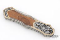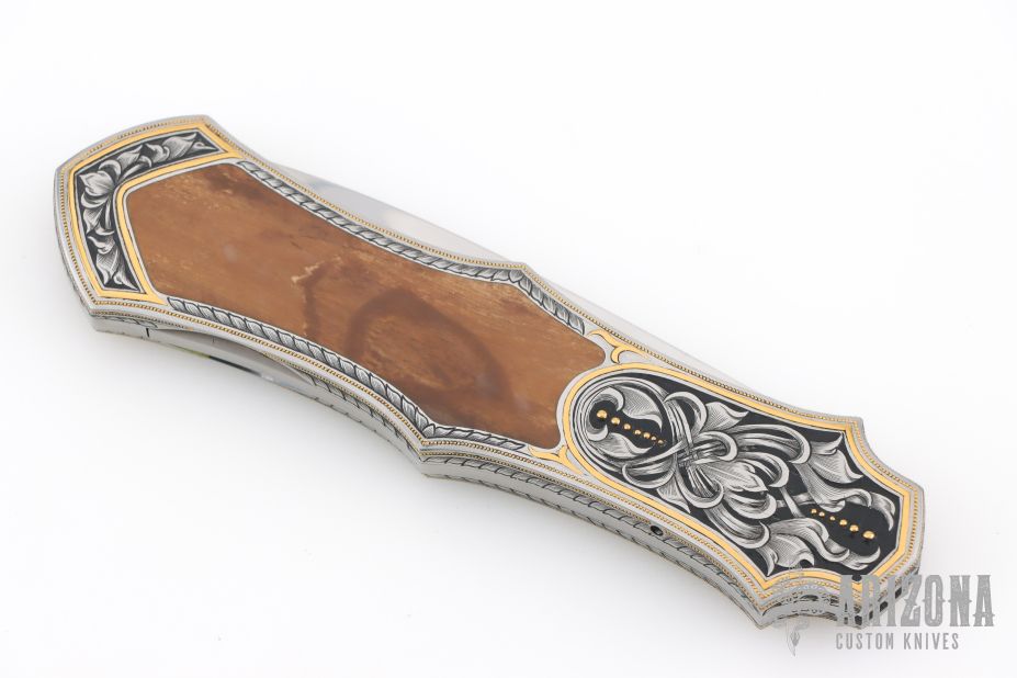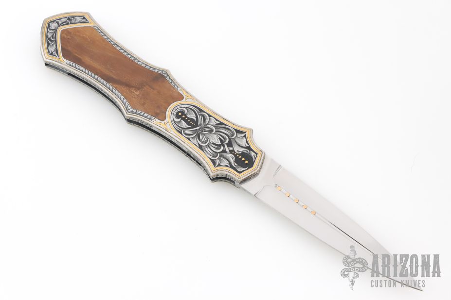 This "Dolores" Auto by Rick Genovese was magnificently engraved by Julie Warenski. It features a hand rub satin finished blade with false top edge and 5 gold pin inlays. The handle has a stainless steel frame with amazing engraving, gold inlays everywhere,. Has nice mammoth ivory inlays. Nice blade seating, nice strong action and lockup. Comes with a zippered case. Excellent condition. This is a truly extraordinary piece!