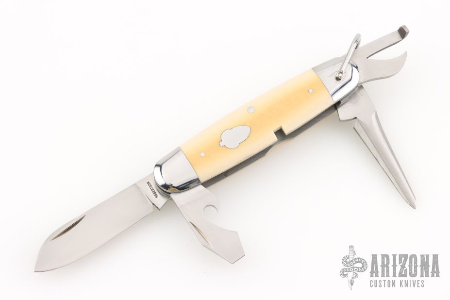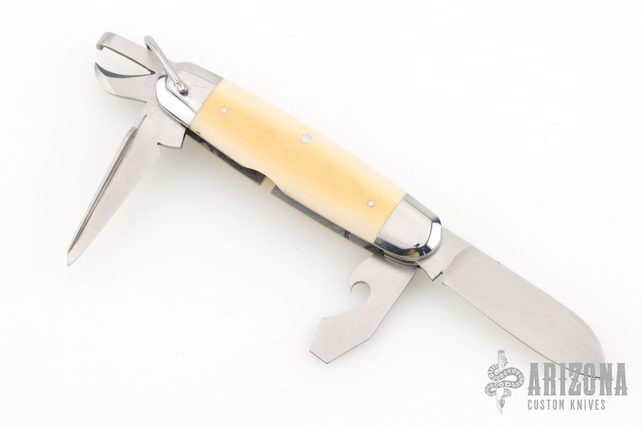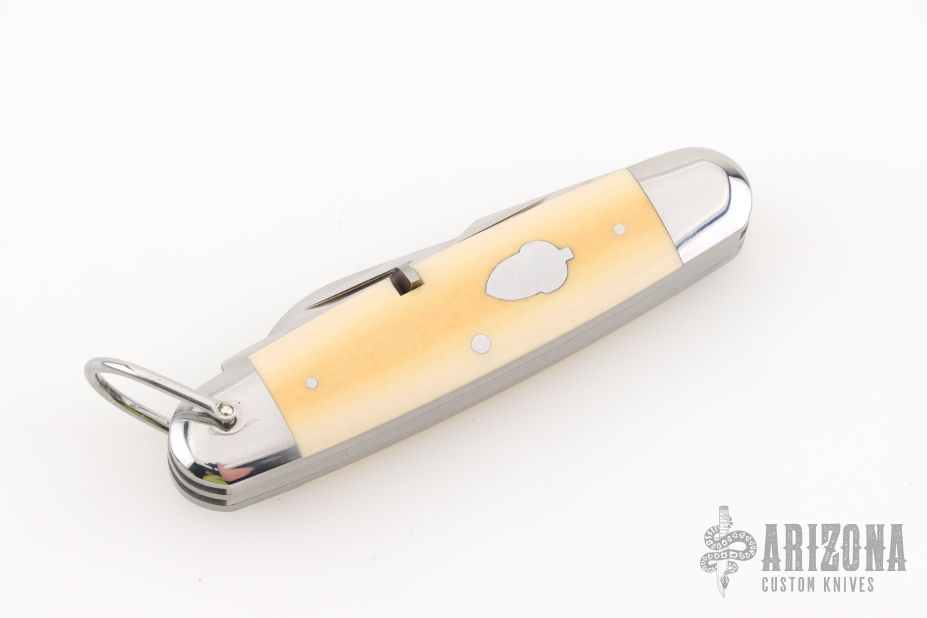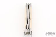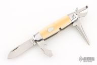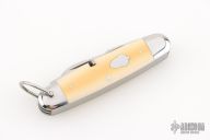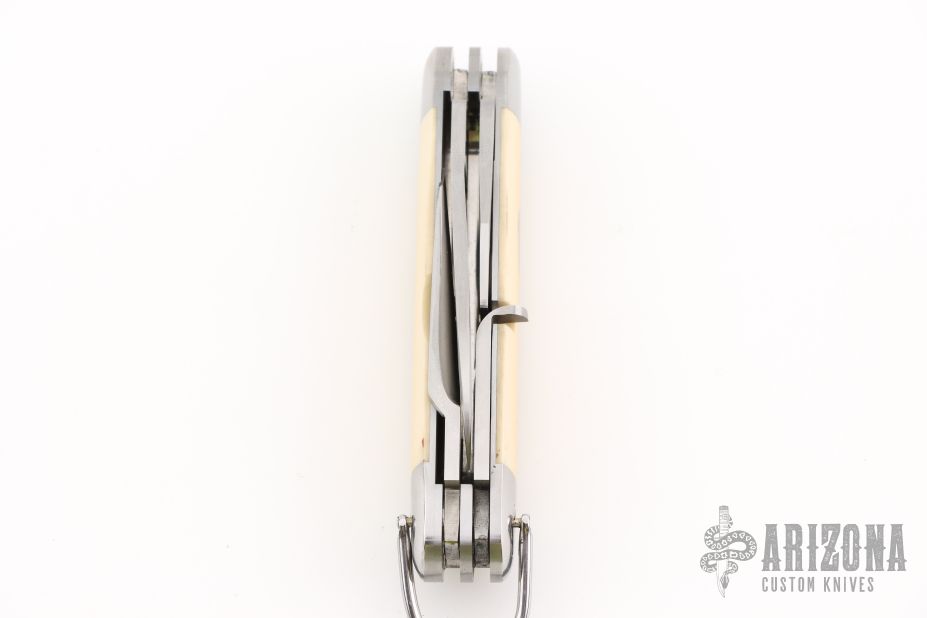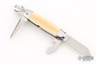 This Slipjoint by Tim Robertson features hand rub satin finished blades with nail nicks. The handle has stainless steel bolsters, Westinghouse ivory paper micarta covers with stainless steel escutcheon, stainless steel liners and springs. Has lanyard bail. Has half-stop, flush in all positions. Comes with a zippered case. Excellent condition.