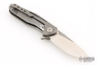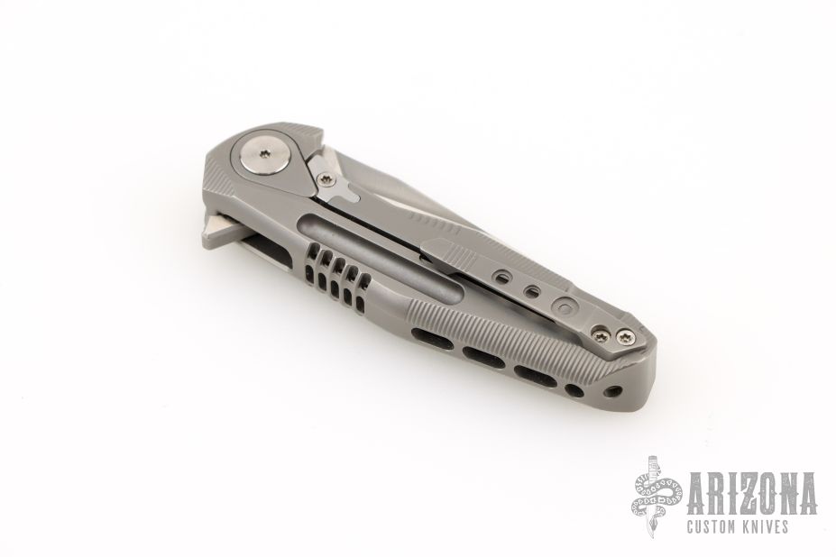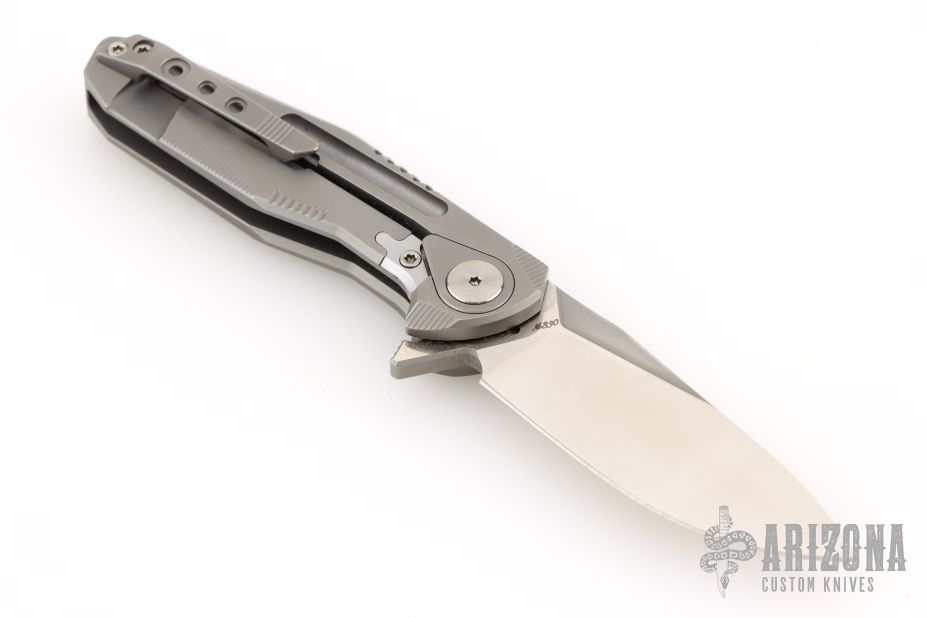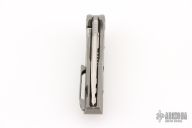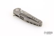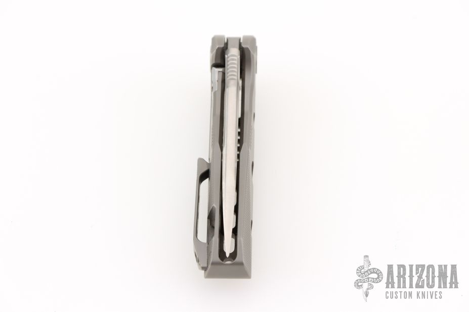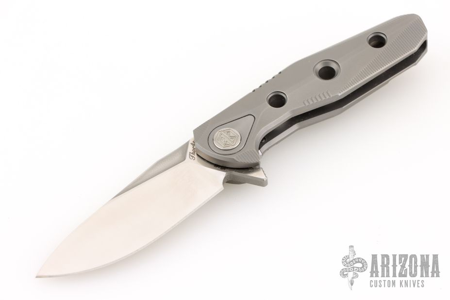 This Thor4S by Rike Knife features a satin finished drop point blade with notched thumb rest and flipper. The handle comprises integrally constructed machined titanium. The matching clip is positioned for tip up carry. Includes original leather slip case. Has a couple light scratches, otherwise Excellent condition.
