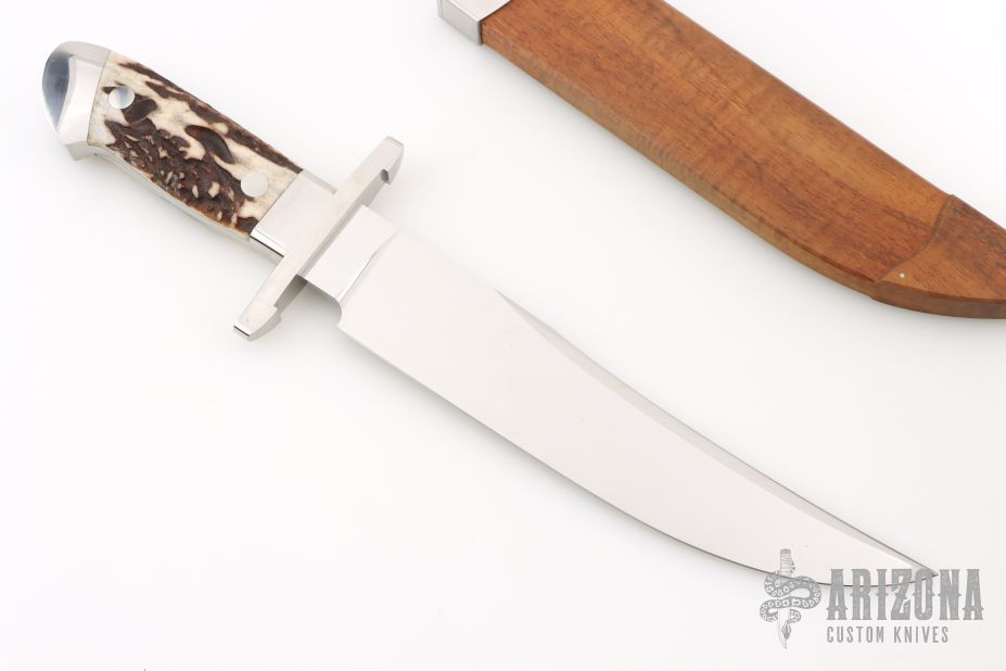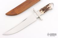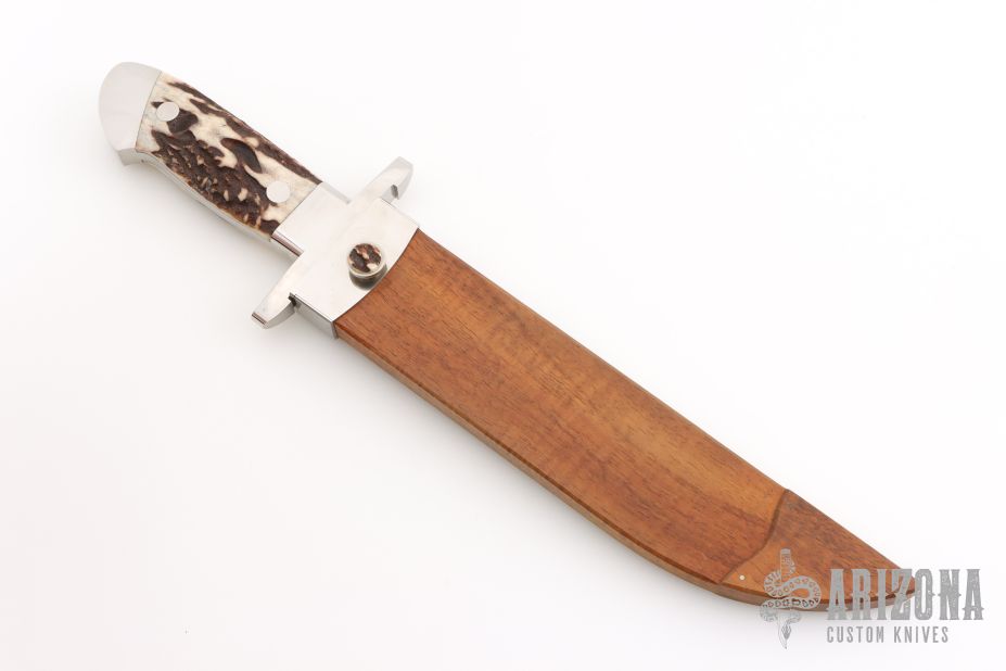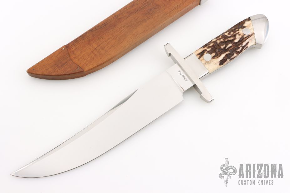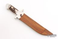 This Bowie by Herman Schneider features a hand rub satin finished blade with sharpened top edge, .230" blade stock, 1.696" blade depth, hidden/frame tang construction. The handle has a satin finished stainless steel guard and collar, stag scales and a stainless steel frame. Comes with a wooden scabbard with stainless steel fittings and stag inlaid belt stud. Excellent condition. Comes with a zippered case.