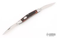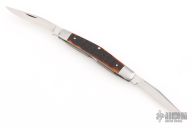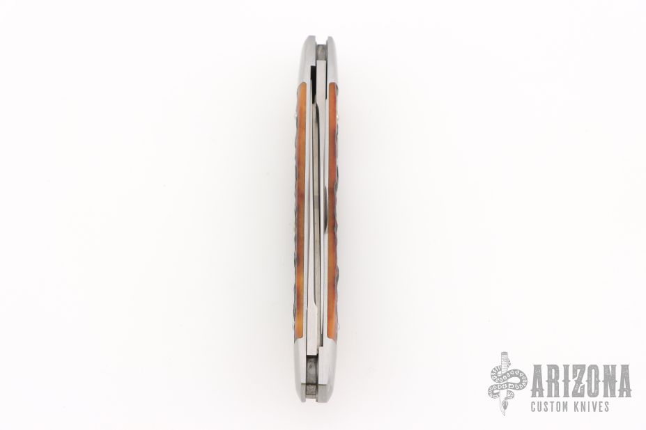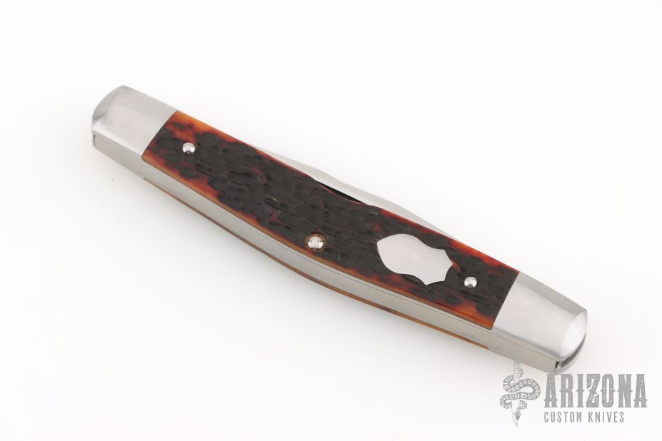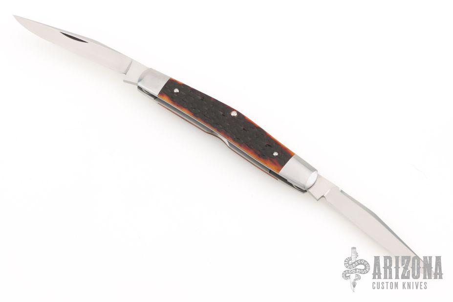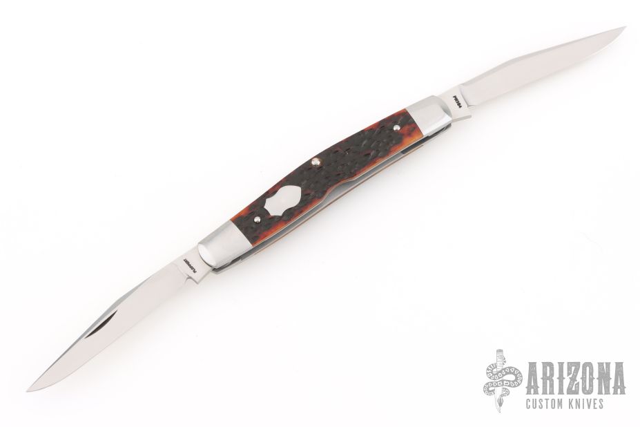 This knife by Tom Ploppert features hand rub satin finished blades with nail nicks. Halfstops and are flush in all positions. The handle has stainless steel bolsters, jigged bone covers with a stainless steel escutcheon, stainless steel liners and spring. Includes a padded zippered case.  Excellent Condition.