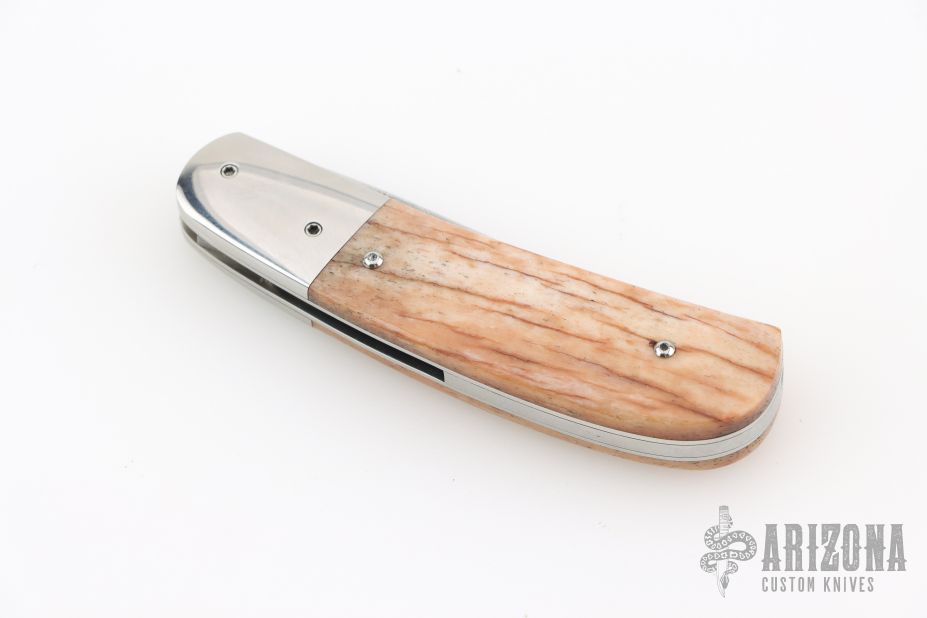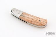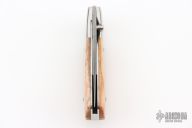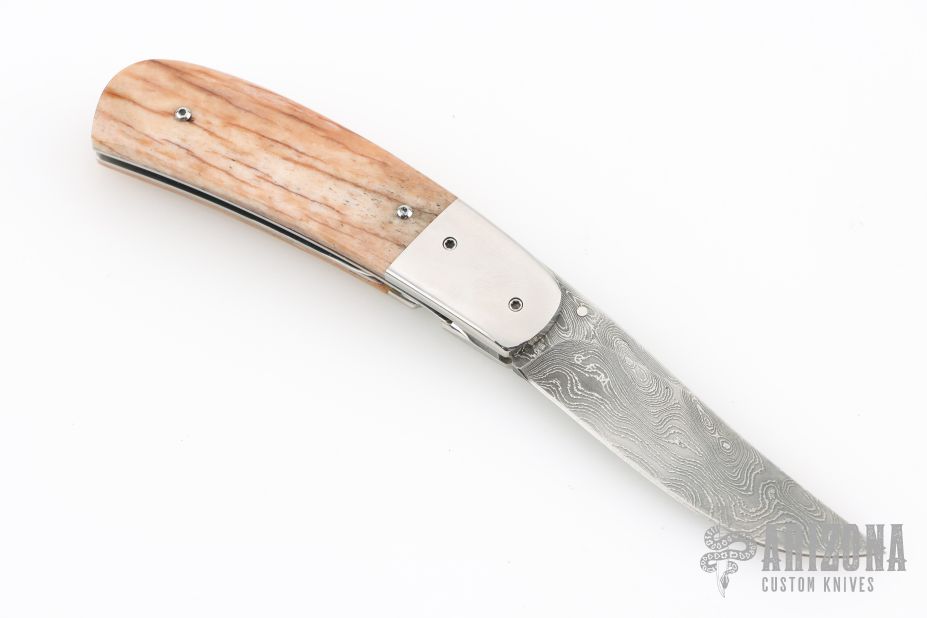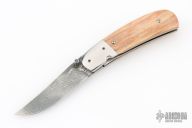 This linerlock from George Muller features a damascus blade, polished stainless bolsters and bone scales. Stainless backspacer and liners. Good lockup, detent, and seating. Single thumbstud. Comes in a zipper case. Has some light scuffs and scratches, great condition otherwise. Has some light vertical lock-rock.