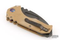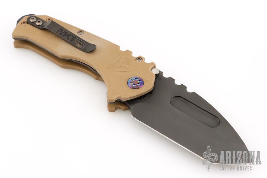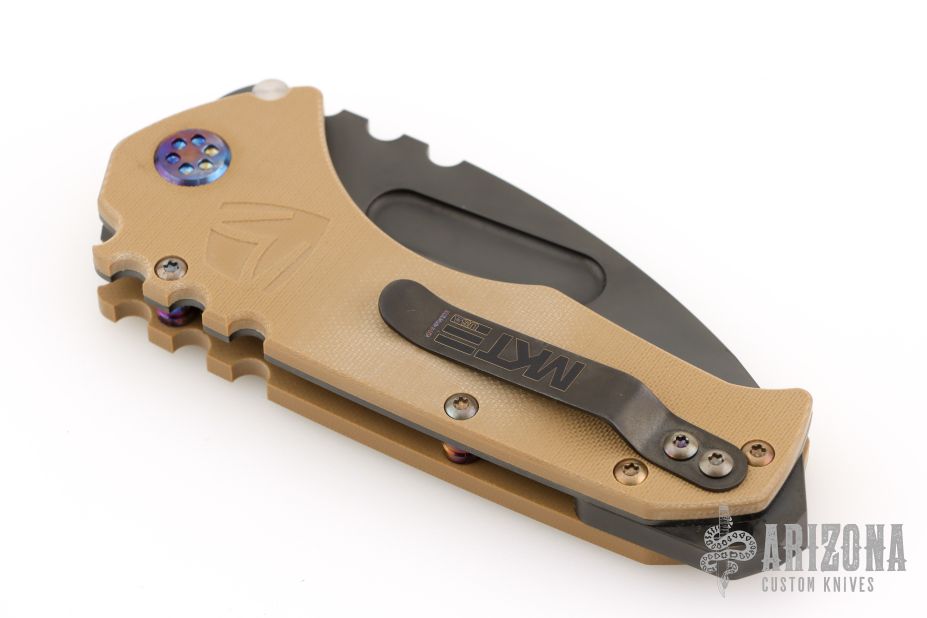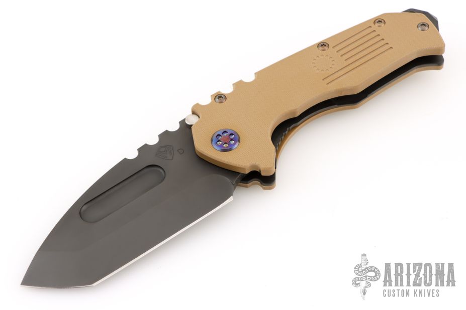 The Production Praetorian Scout is every bit as superb as other Medford knives. You'll enjoy the powerful MKT design in a lightweight EDC-friendly package with a full-sized blade complete with standard no-bull spine texture, a wide thumb groove opener, and a matte bead blast/stonewash finish. Its handle is outfitted with a resilient titanium liner lock and durable, textured black G-10 slabs machined with the Betsy Ross US flag and the Medford logo. A smooth patch under the stamped titanium clip has been included for frustration-free pocket carry. Features: D2 tool steel blade for top-notch wear resistance and performance. Textured G-10 handle offers a solid, no-slip grip in all conditions. Smooth handle surface beneath the titanium pocket clip allows easy pocket carry without the wear and tear. Bronze hardware and clip. Comes with original box, papers dated May 23 2023, and zippered case. Excellent condition.