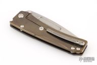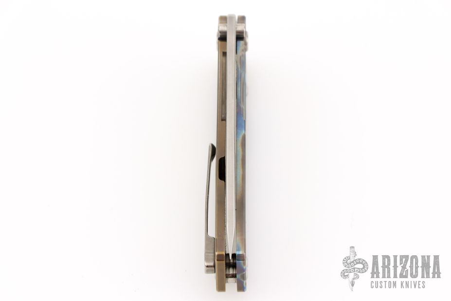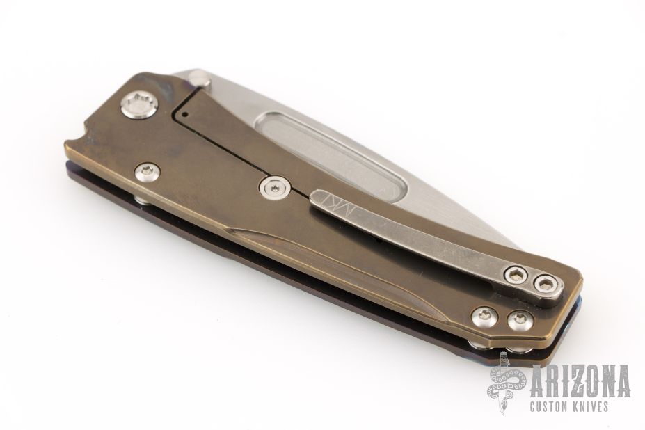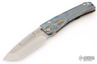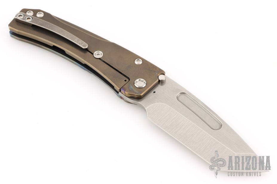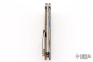 This Slim Midi Marauder from Medford Knife and Tool features a stonewashed drop point blade with thumb stud and recess. The handle is comprised of a milled, anodized and tumbled titanium frame with tip up clip over a satin finished stainless steel spacers. Excellent detent, lockup, and seating. Original box and case. Excellent condition
