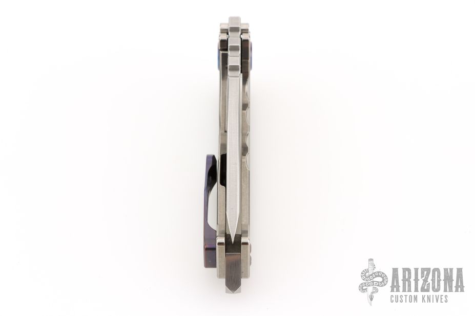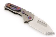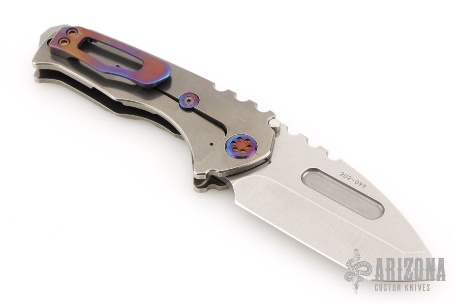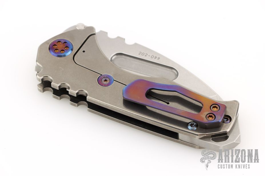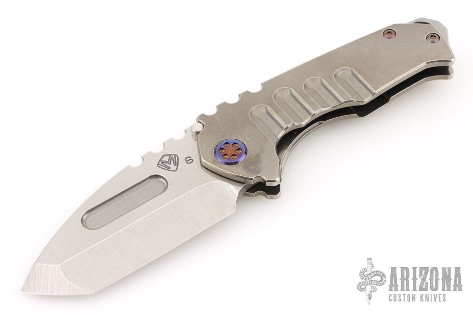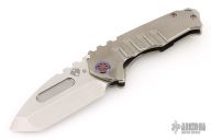 This Praetorian Genesis T by Medford Knife and Tool features a tumbled tanto blade with fullers and notched thumbrest. The handle has a tumbled titanium frame with a titanium tip up pocket clip and a D2 backspacer/glass breaker with lanyard bail.  Includes original box, vault style case and original papers dated June 1, 2022. Excellent condition.