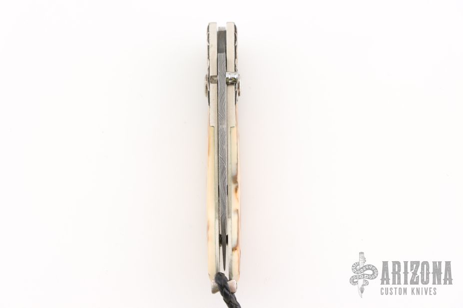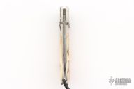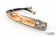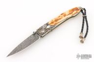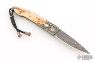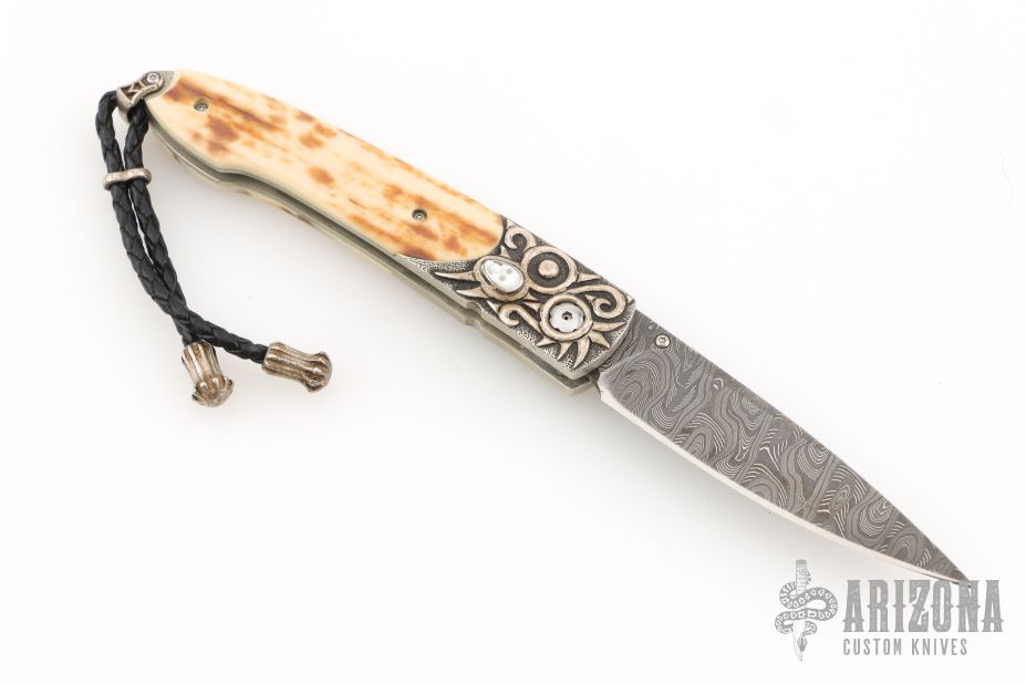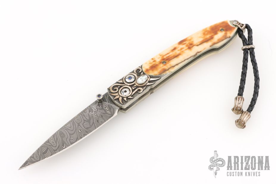 The B10 AG8 AG Russel Exclusive by William Henry features a Mike Norris Hornets Nest Damascus blade with single thumbstud with Sapphire inset in gold bezel. The frame is carved sterling silver with carved pearl skulls, Mammoth ivory scales, Sapphire set in gold bezel the button. The piece exudes a sophisticated elegance sure to please any owner. Excellent condition.