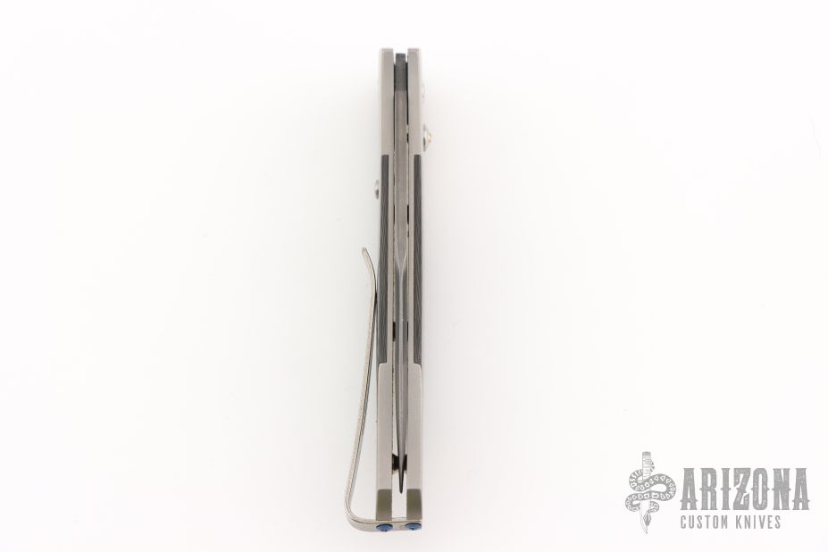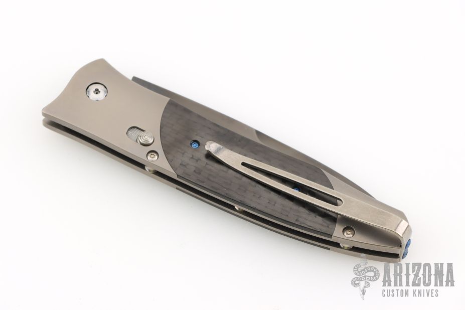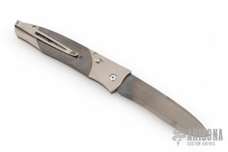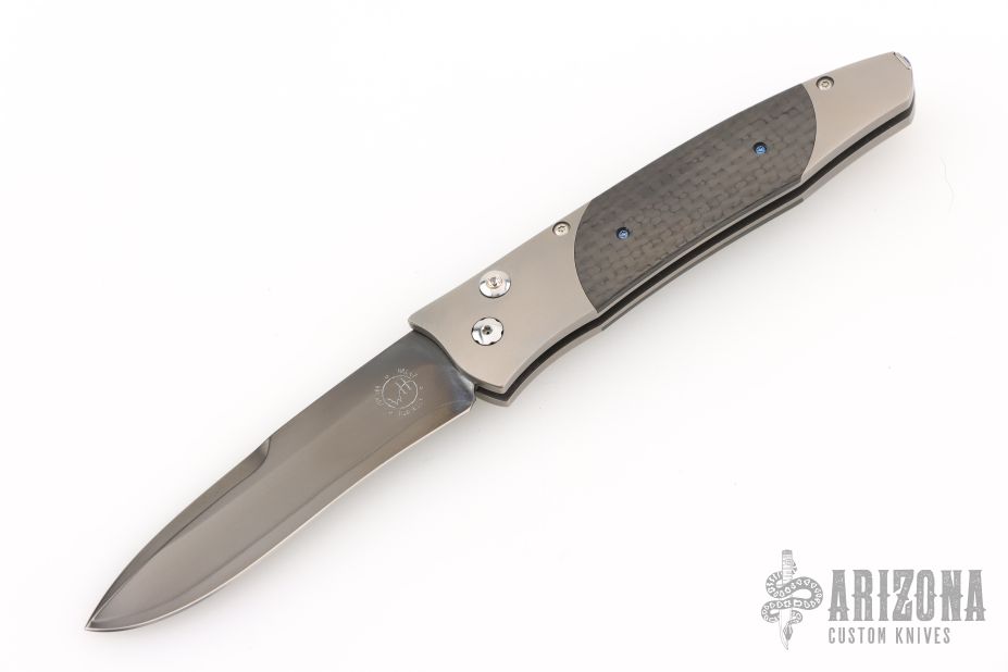 This GenTac features a DLC coated San Mai blade with ZDP-189 core. The handle has a titanium frame with carbon fiber inlays. Includes a slide safety and white topaz inlay in the push button. Includes certificate of authenticity dated April 9, 2008 and original box. Excellent condition. This was a limited run of 50 and this is #46.