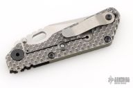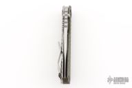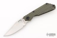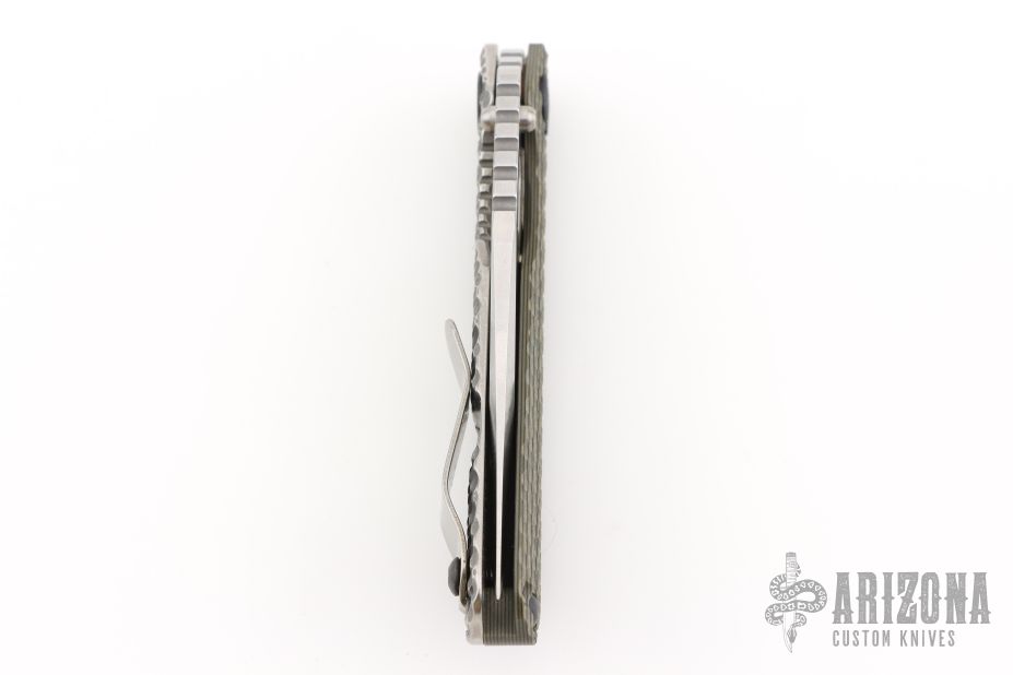This SNG DGG by Strider has a satin/stonewash finished Bowie blade with dual thumb studs, thumb hole, and notched thumb rest. Handle has a dirty olive G-10 and bead blasted titanium "Gunner Grip", lockbar stabilizer, and titanium tip up clip. Nice detent, lockup and blade seating.  New Conditon. Comes with a zippered case.