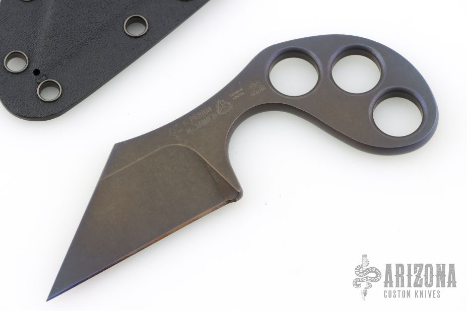 This knife by Michael Janich and Fred Perrin is from a limited run of 200, this one is #013. It features a dark stonewashed and anodized wharncliffe titanium blade and handle, .234" blade stock and 1.346" blade depth. Comes with kydex neck sheath and Velcro case. New from maker.